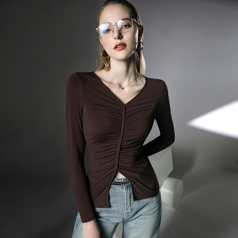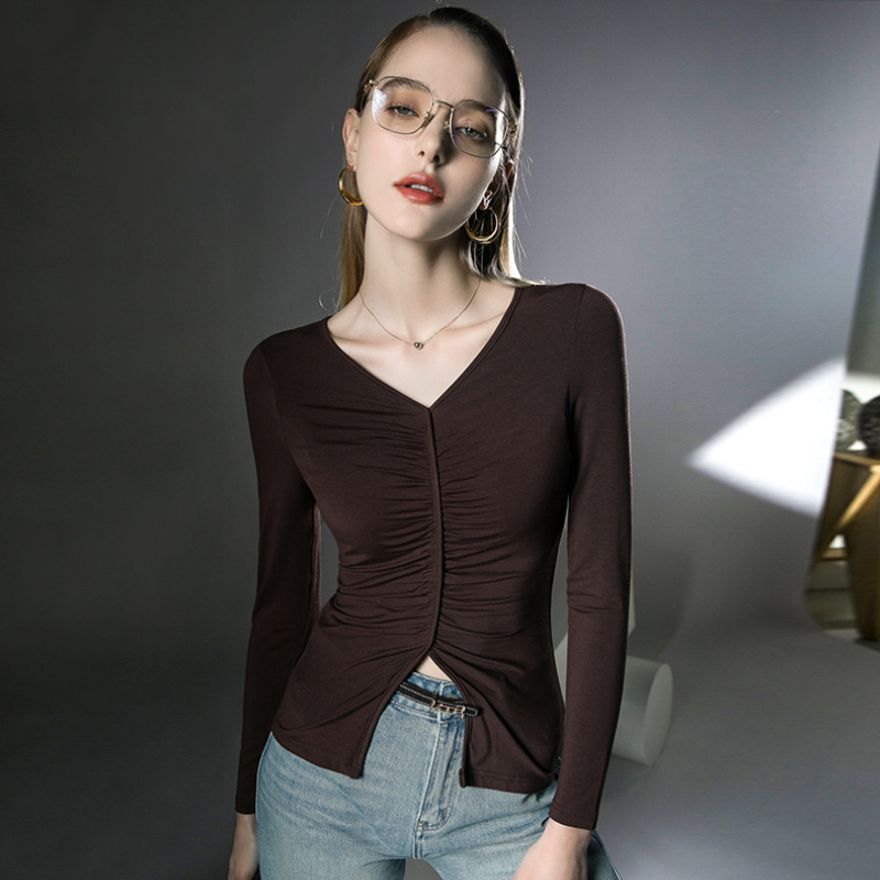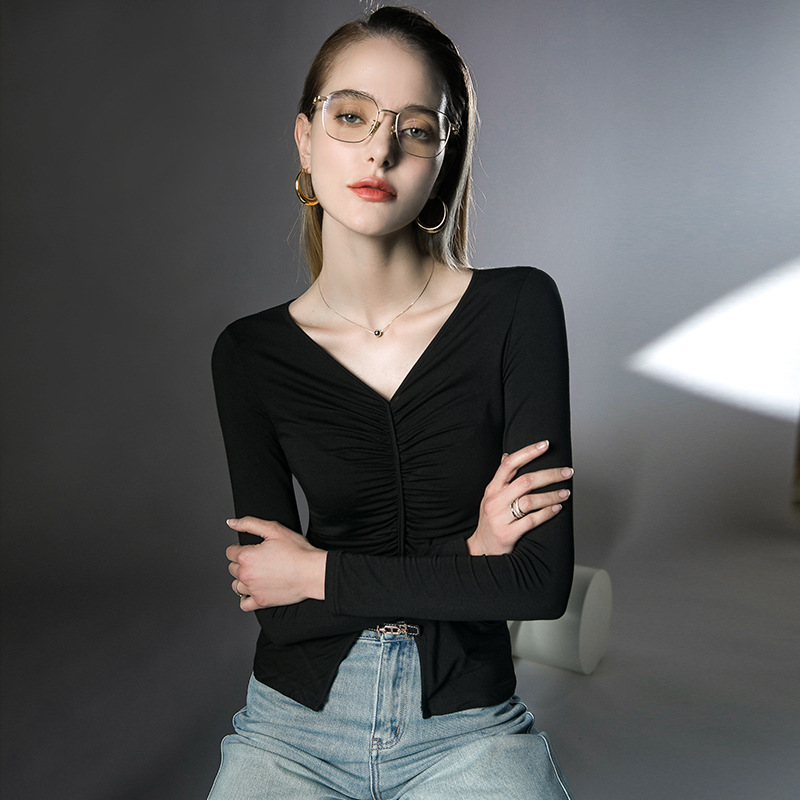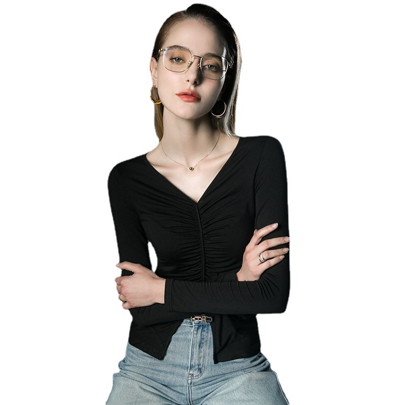 春装新款上衣V领内搭打底衫褶皱洋气欧货小衫长袖