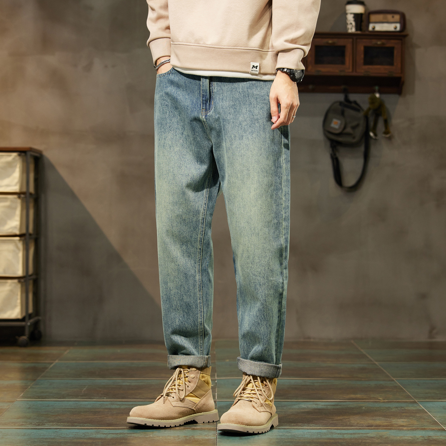 春季新款男装美式高街宽松锥形哈伦长裤子复古做旧百搭牛仔裤