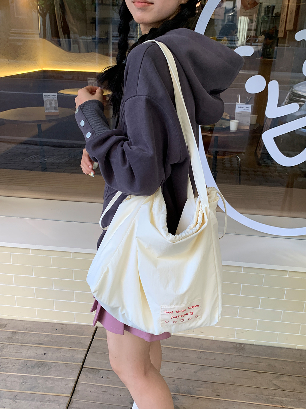 尼龙束口托特包-暖杏白