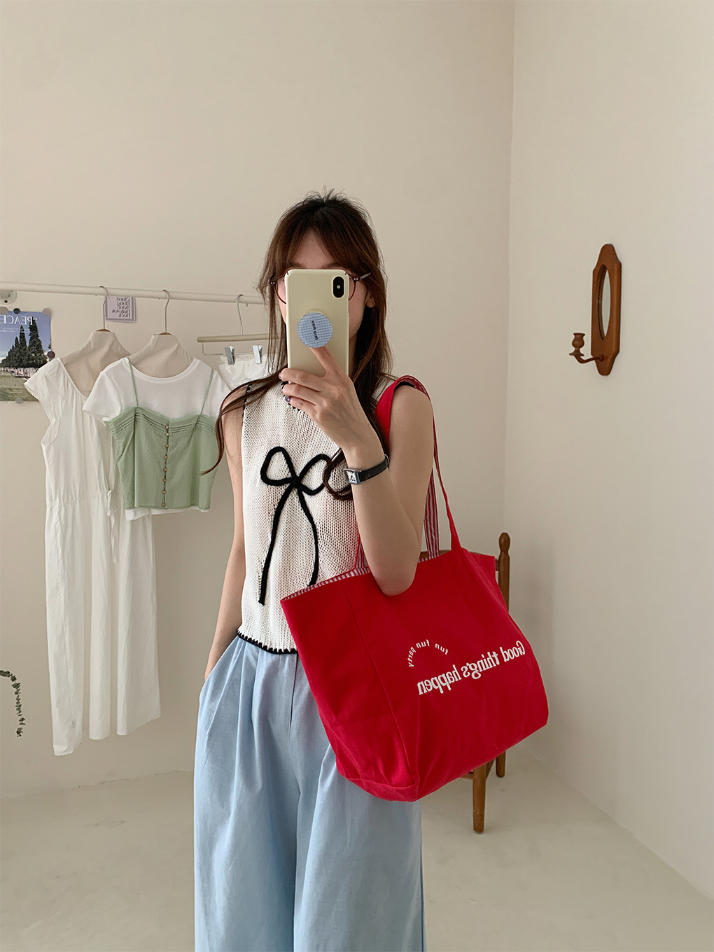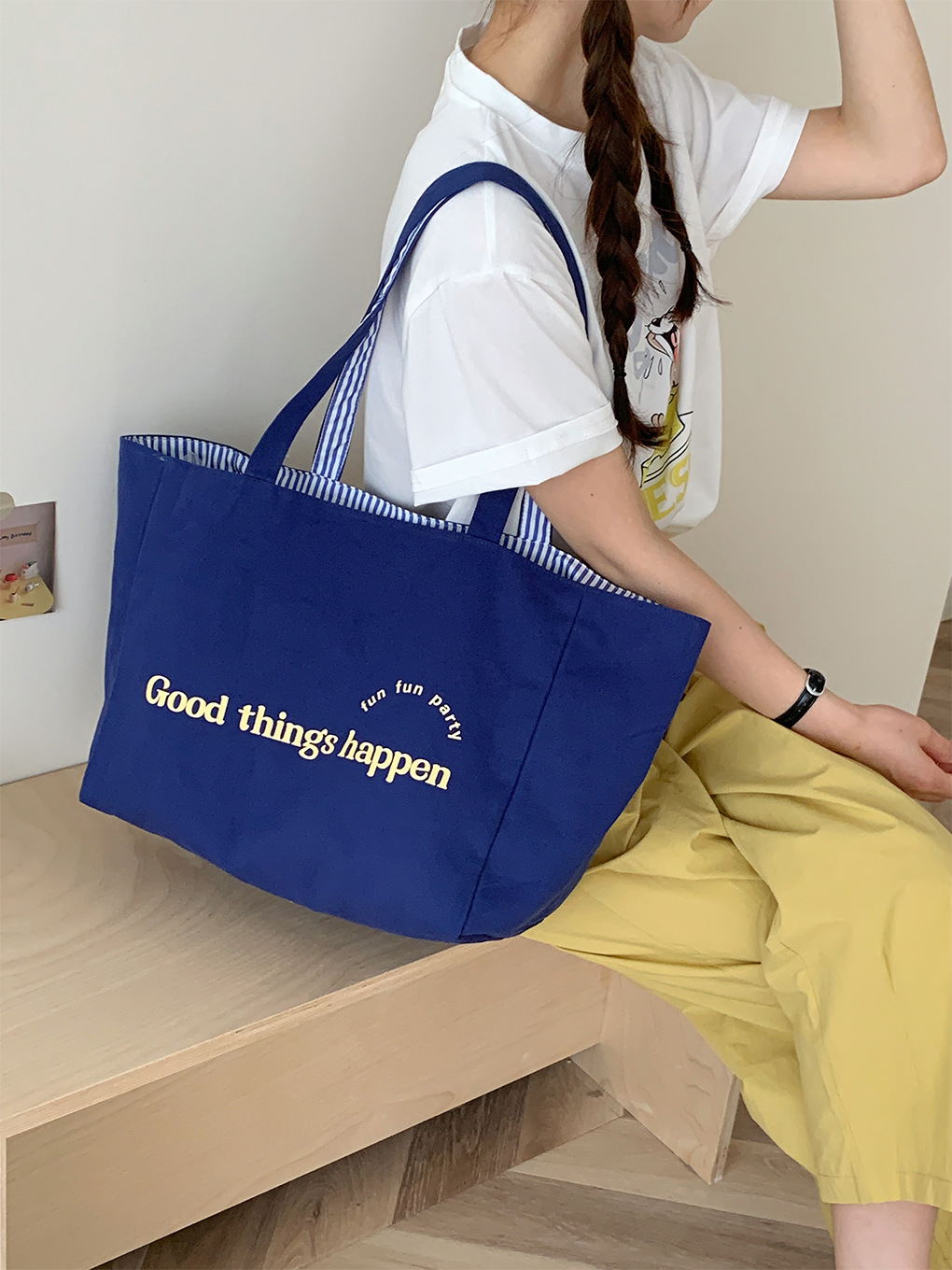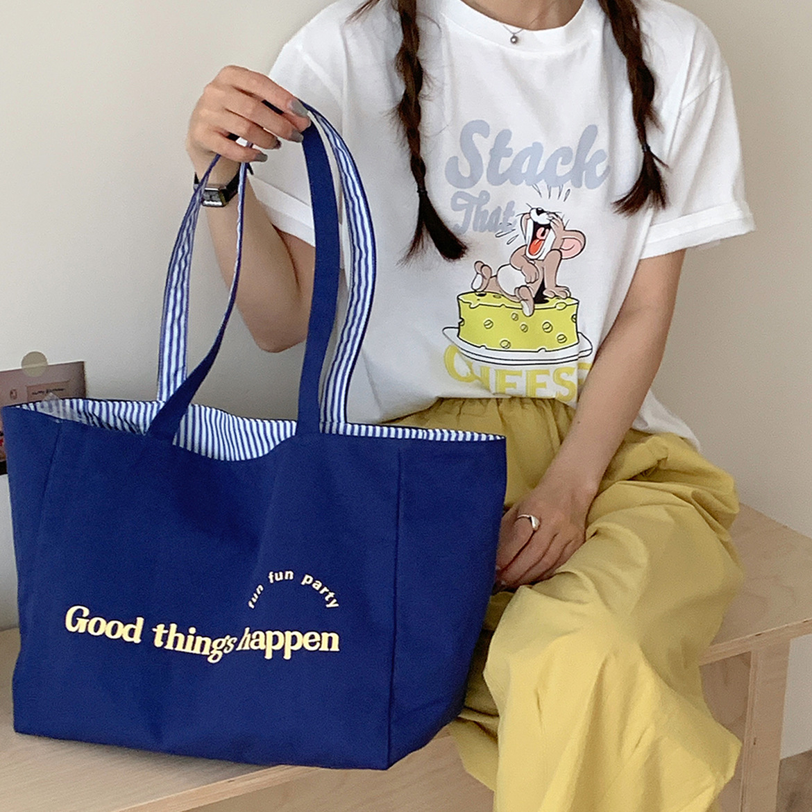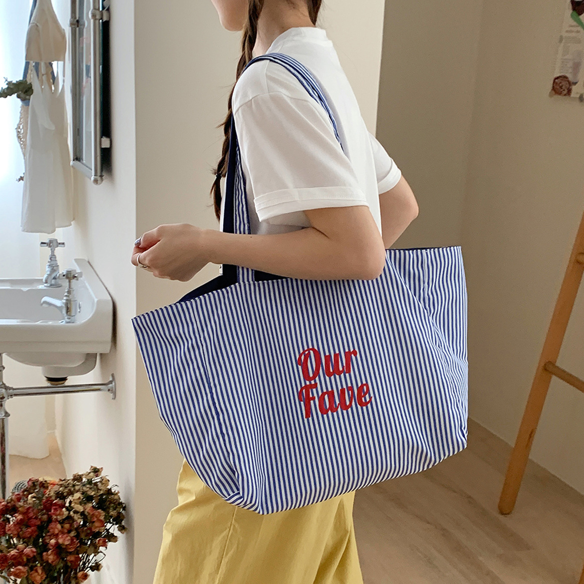 新款可爱卡通插画背心包时尚条纹女士单肩包大容量上课通勤托特包