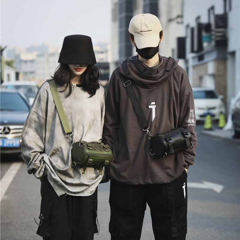 纯色圆筒单肩包大容量防泼水情侣斜挎包大容量潮酷街头男背包跨境