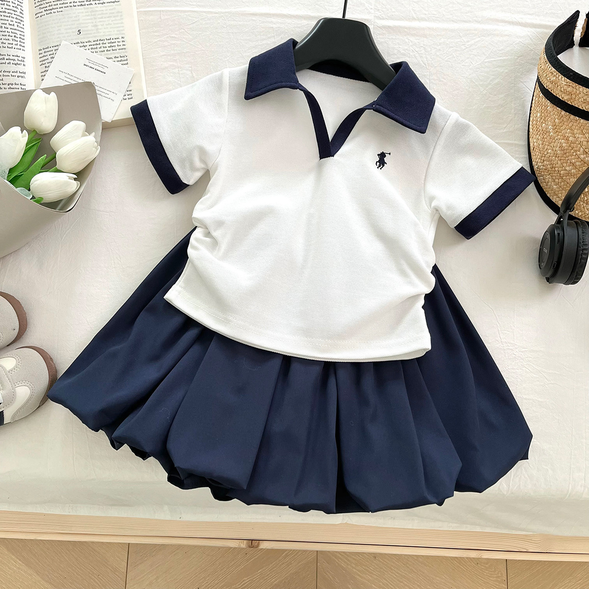 女童套装2025夏季新款Polo领短袖t恤+休闲花苞短裤两件套