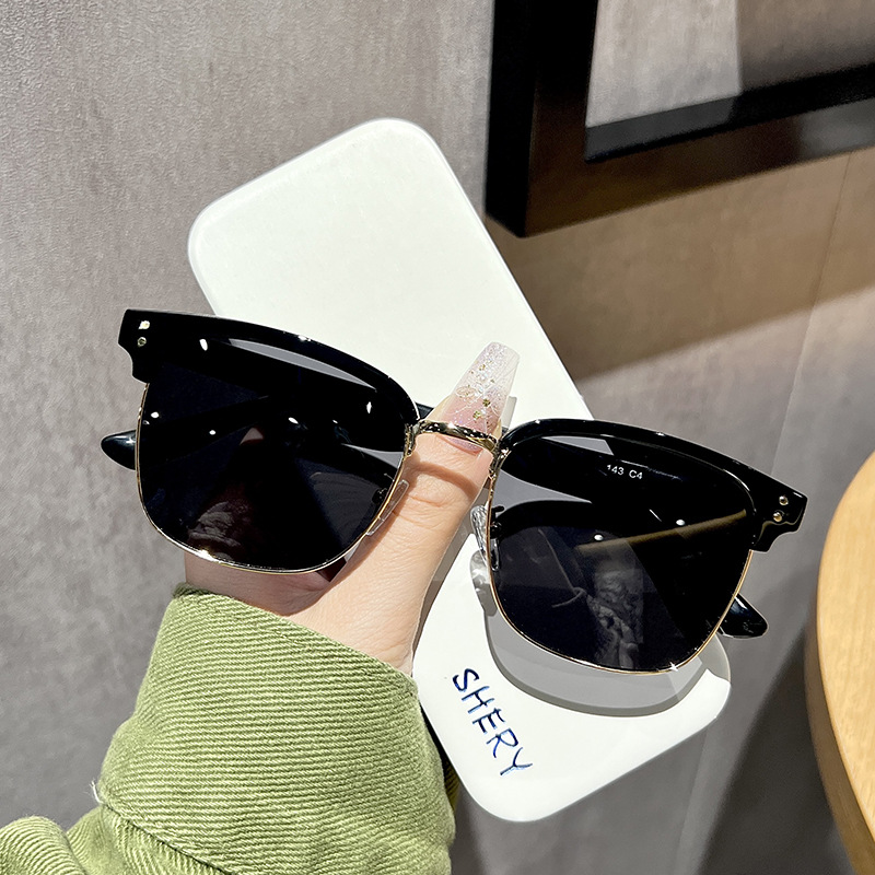 新款黑色半框墨镜男复古偏光太阳镜女文艺高级感防紫外线遮阳墨镜