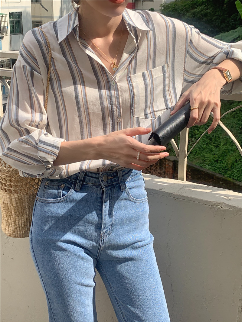 韩版复古洋气简约宽松休闲条纹长袖衬衫防晒衫