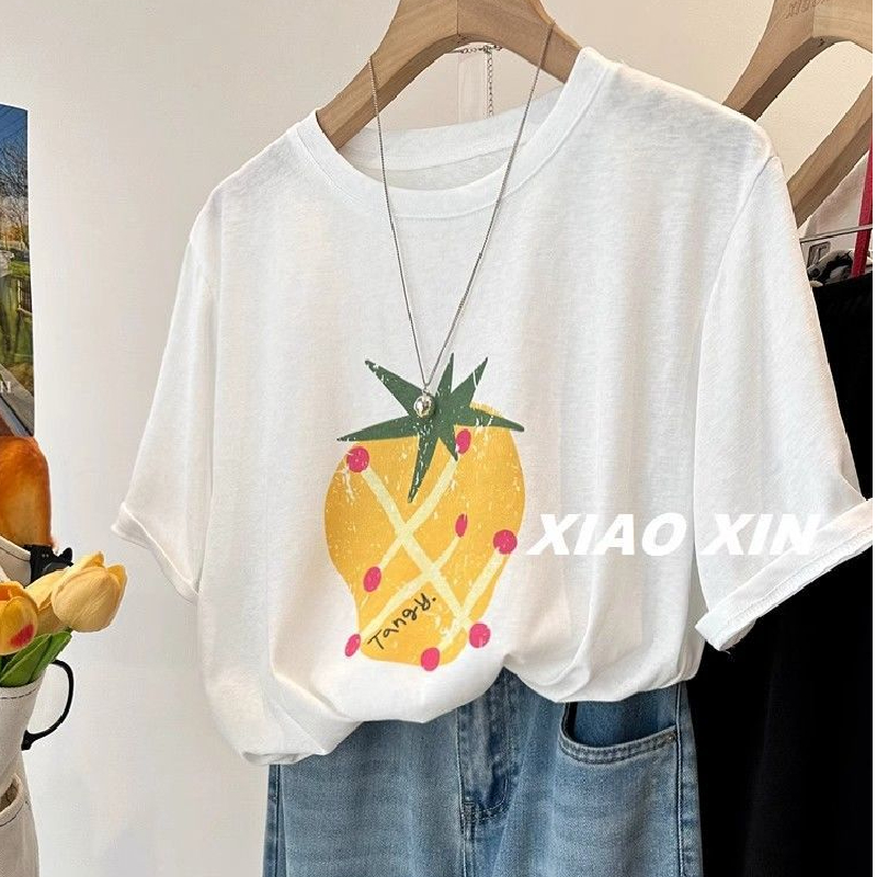 新款大码甜美菠萝印花短袖T恤女精梳棉宽松显瘦休闲上衣体恤夏季