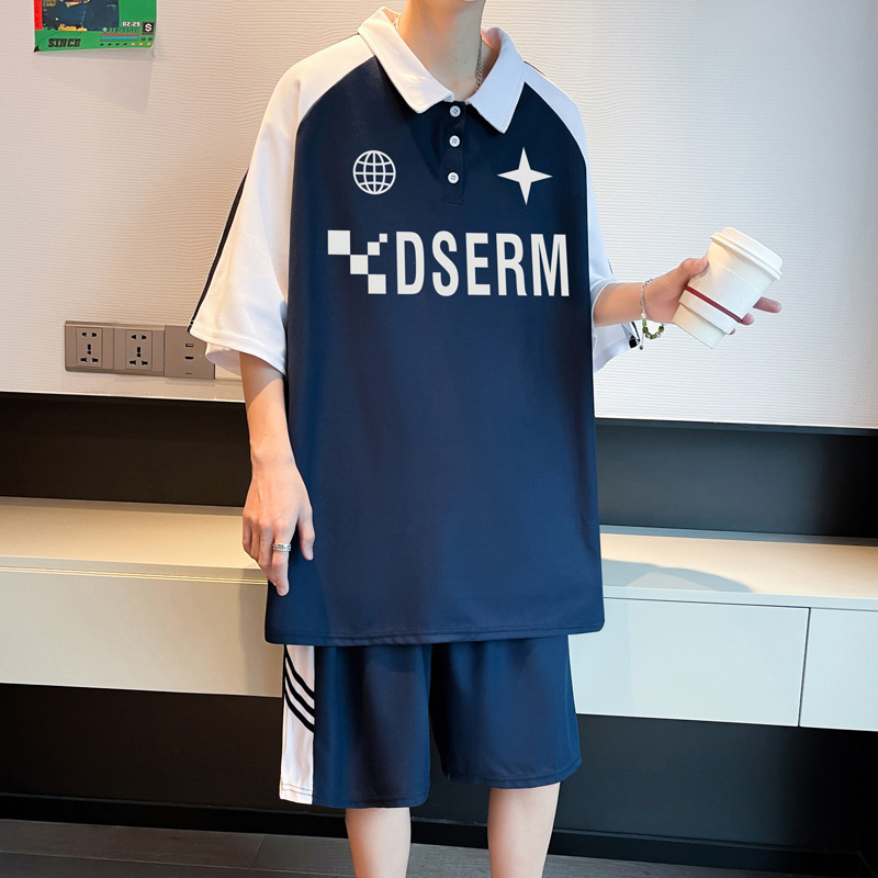 夏季新款学院风拼接设计polo衫初高中学生短袖T恤男两件套装