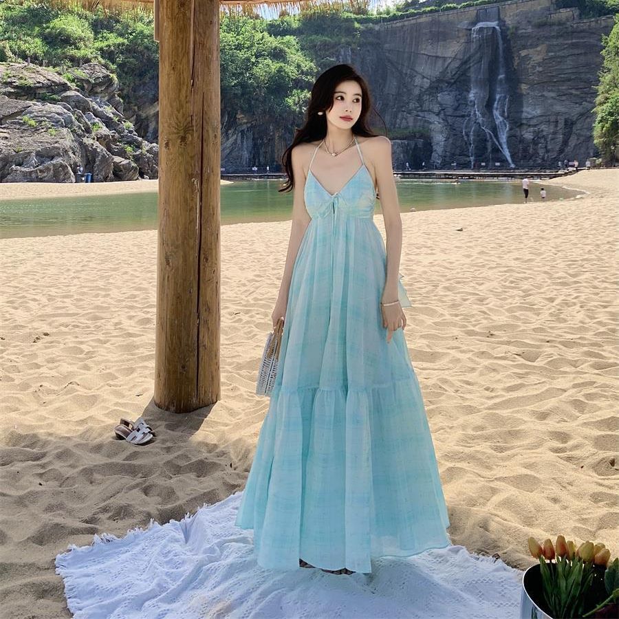 风信紫薄荷绿V领挂脖吊带连衣长裙夏季多巴胺海边度假仙女裙