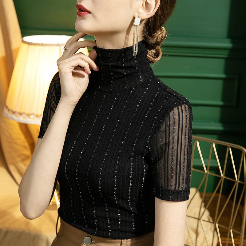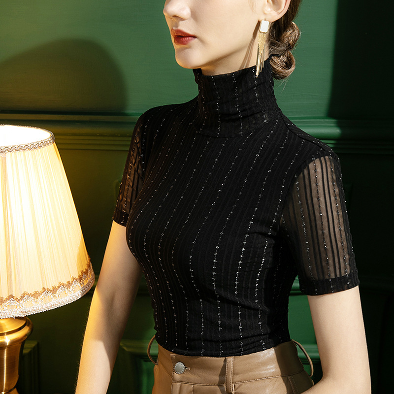 秋季新款高领网纱打底衫女修身内搭条纹亮丝短袖性感黑色T恤