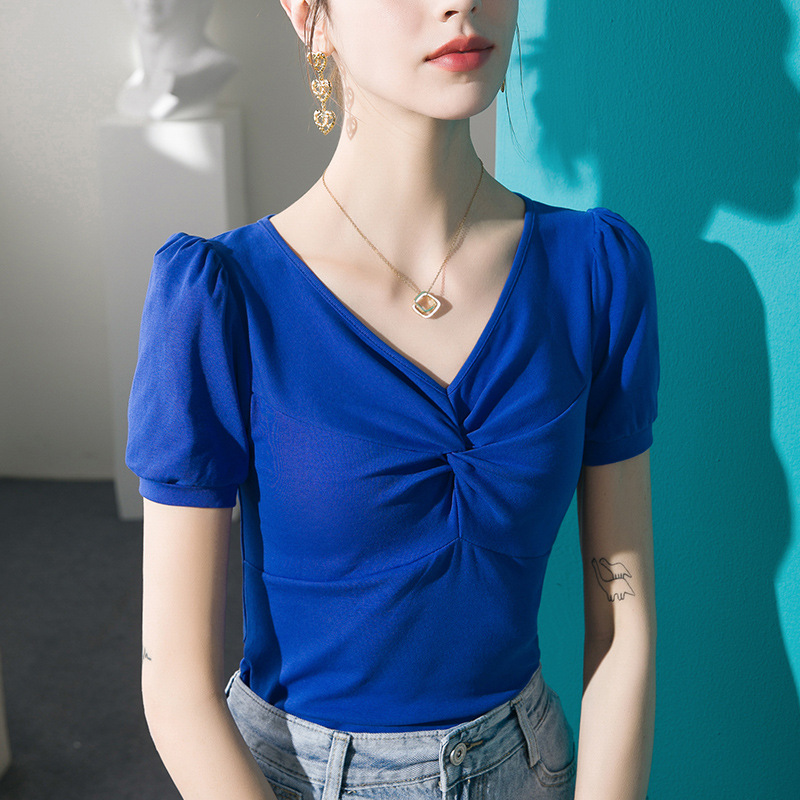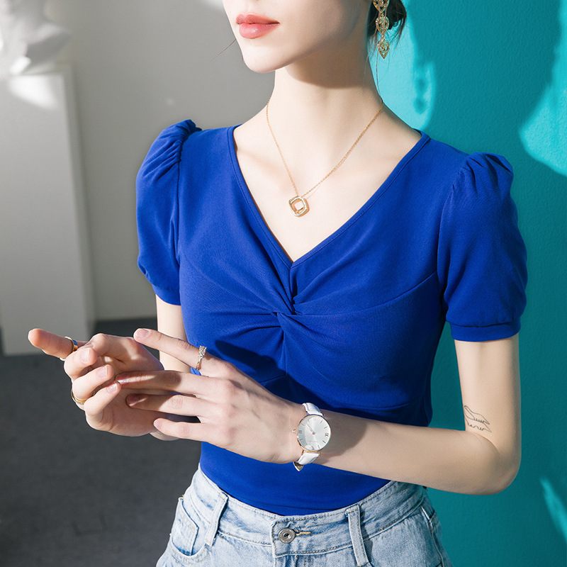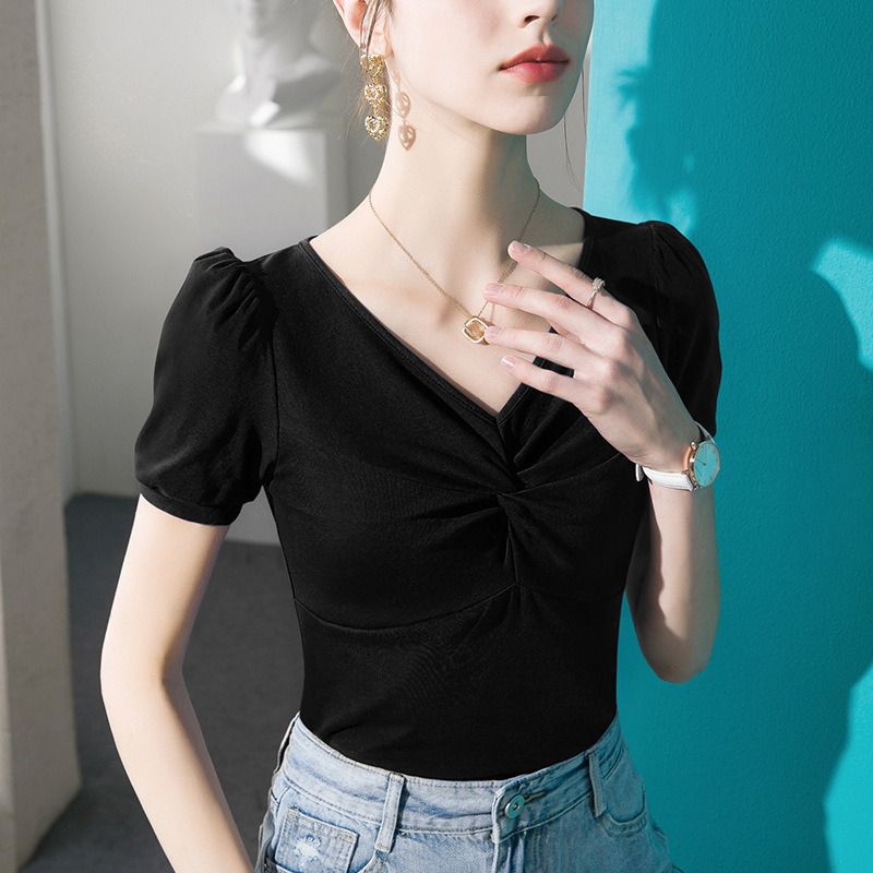 法式V领泡泡袖T恤女短袖修身春夏新款纯棉夏季气质纯色上衣