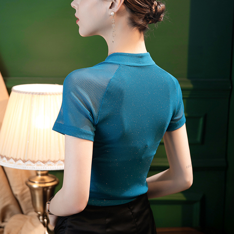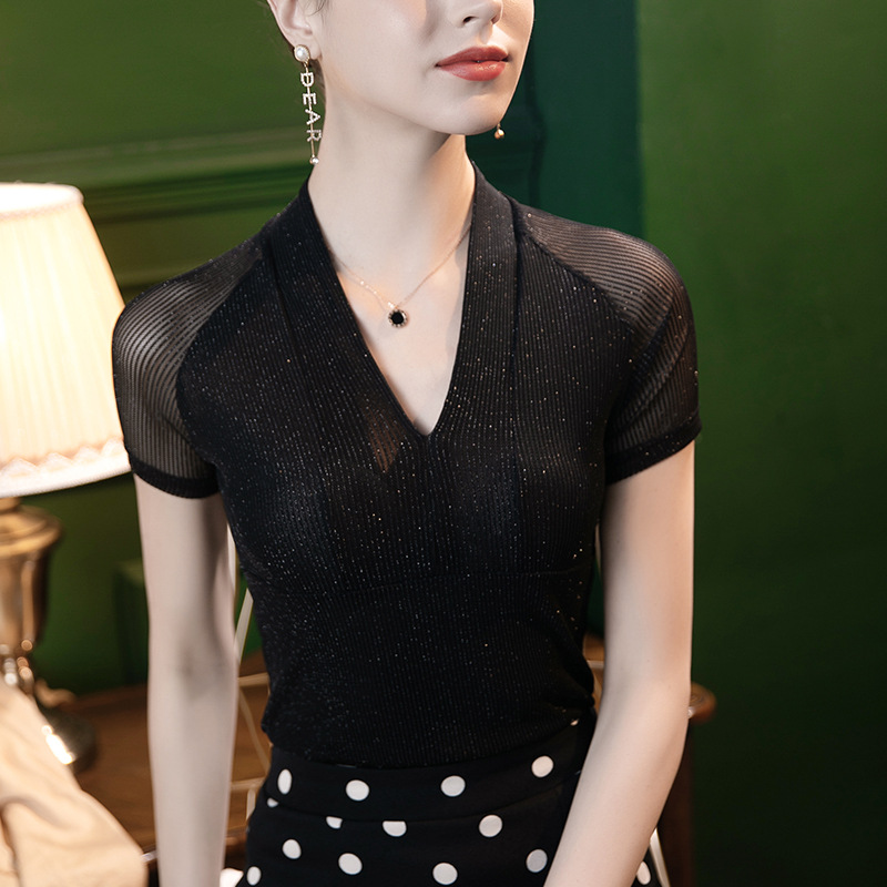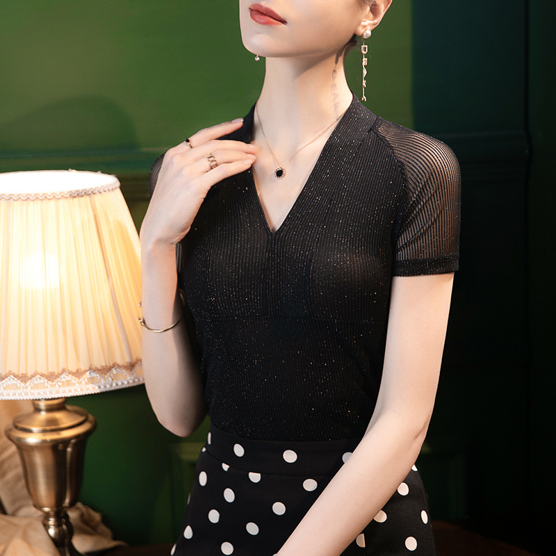 夏装亮丝V领上衣女短袖性感修身夏季新款洋气网纱T恤小衫时尚