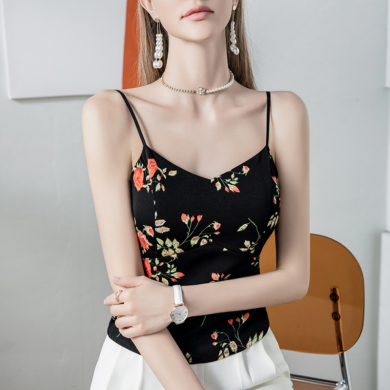 复古印花吊带女露背性感内置胸棉夏季新款女装黑色时髦背心