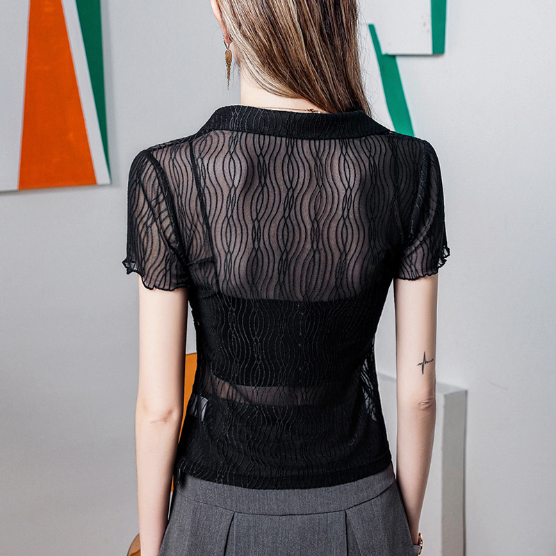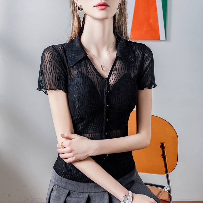 提花蕾丝衬衫女短袖开衫修身夏季新款辣妹风透视女装黑色上衣