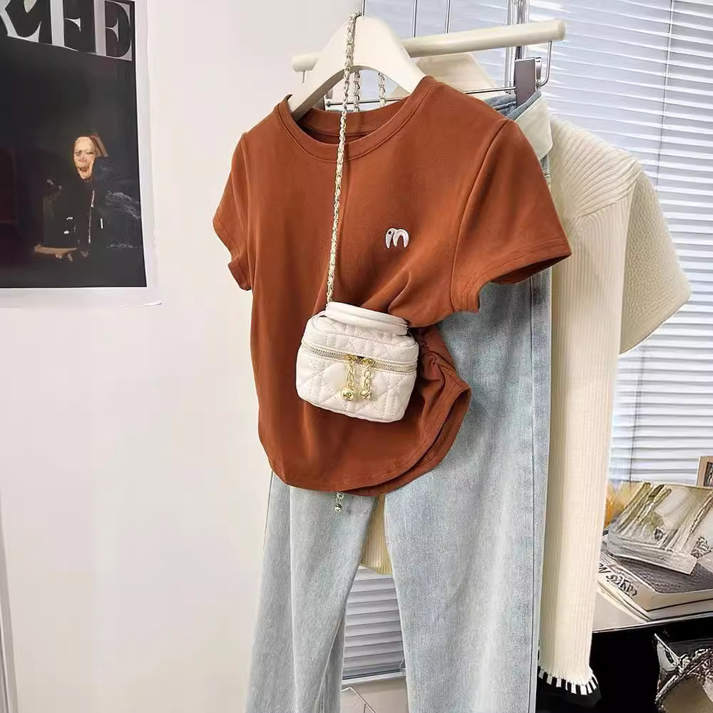 纯棉美式复古短款褶皱短袖t恤女夏季刺绣设计感小众辣妹修身上衣