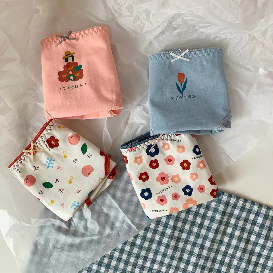 新款泫雅风卡通可爱少女小花内裤森女风印花纯棉舒适中腰三角裤女