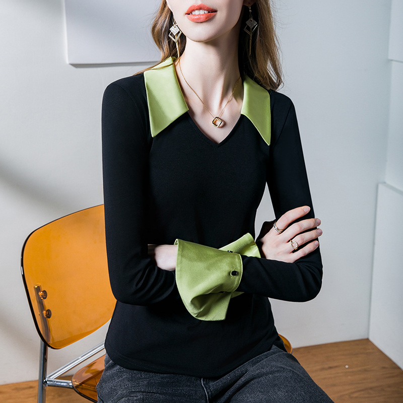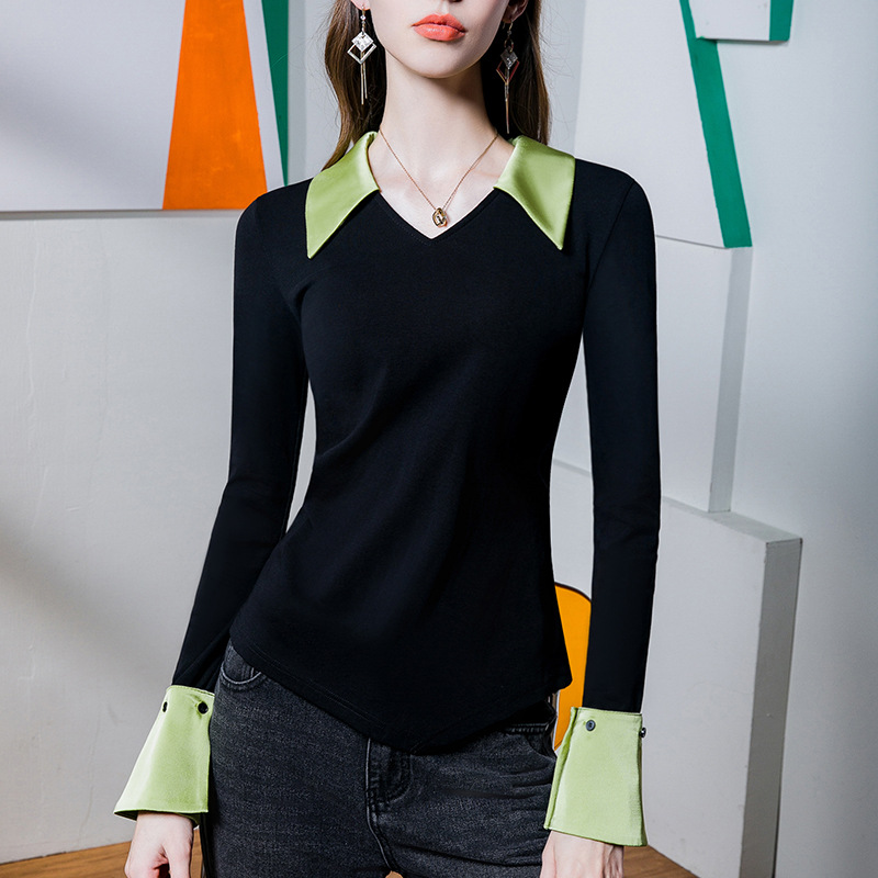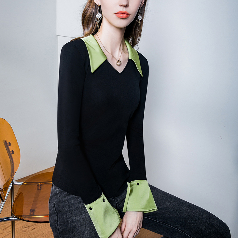 拼色翻领设计上衣女修身春夏新款可拆卸衬衫袖女装时髦小衫