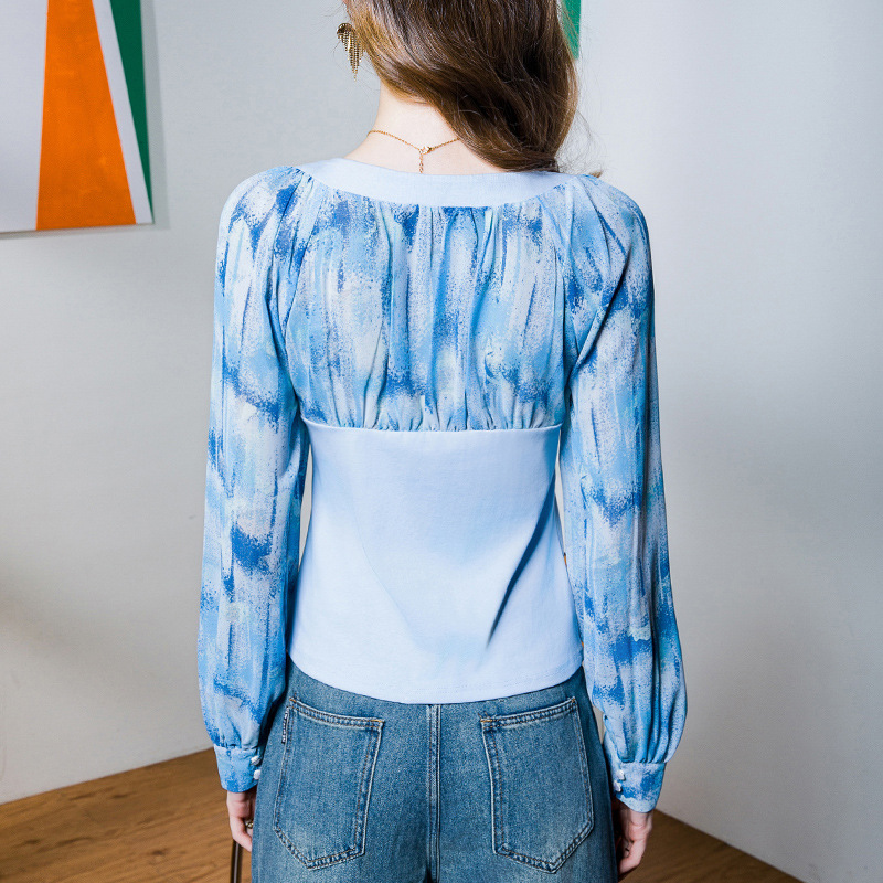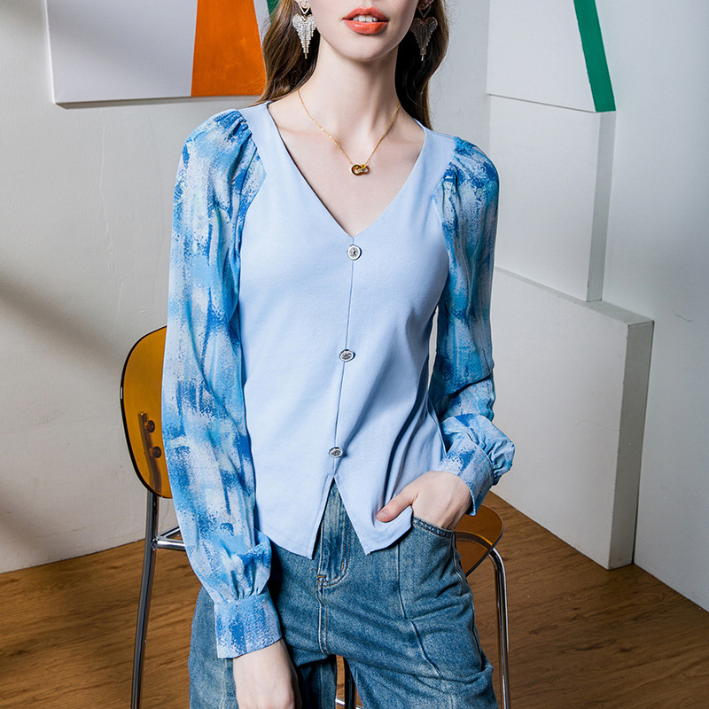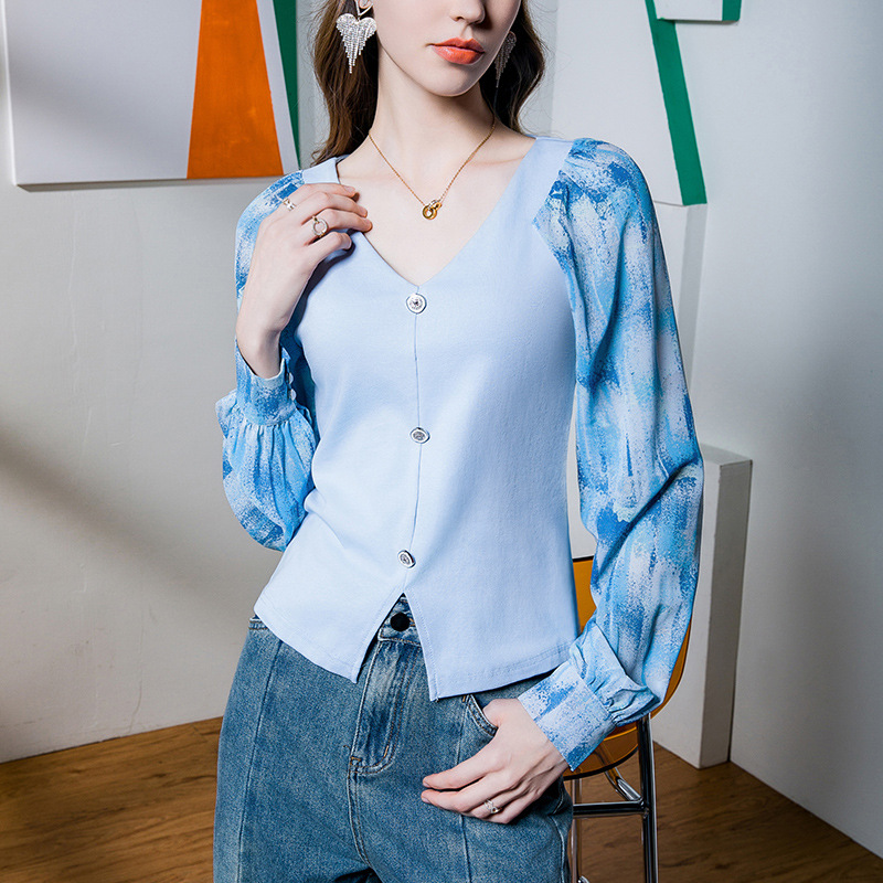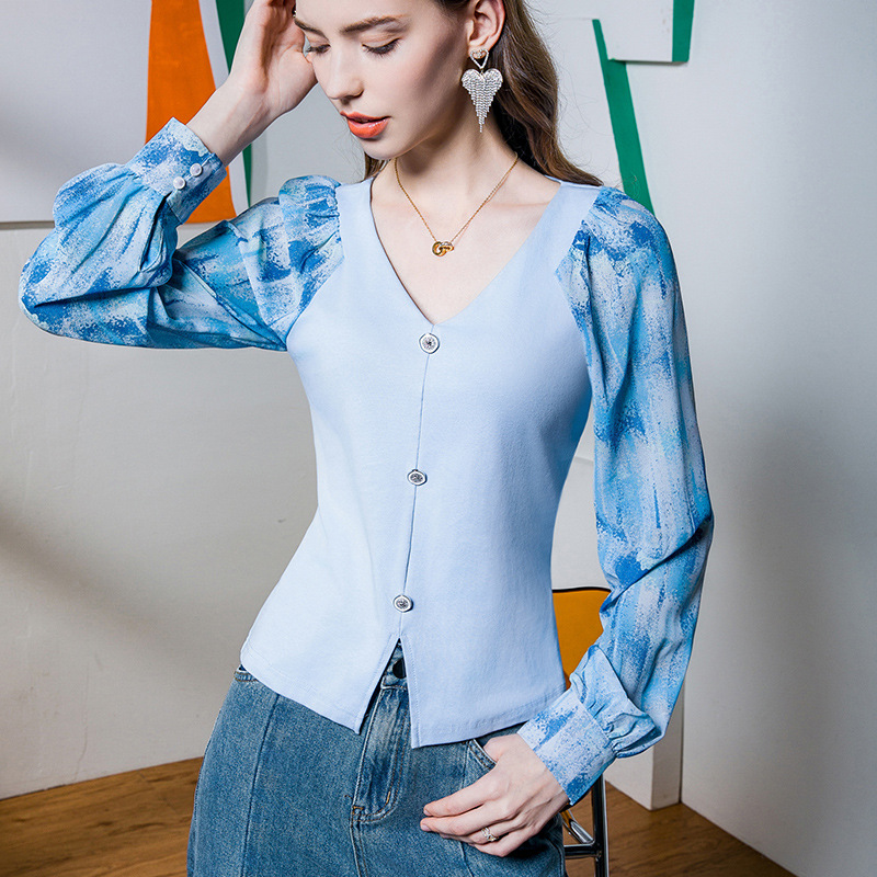 小香风V领纽扣装饰上衣女修身春季雪纺拼接泡泡袖女装小衫
