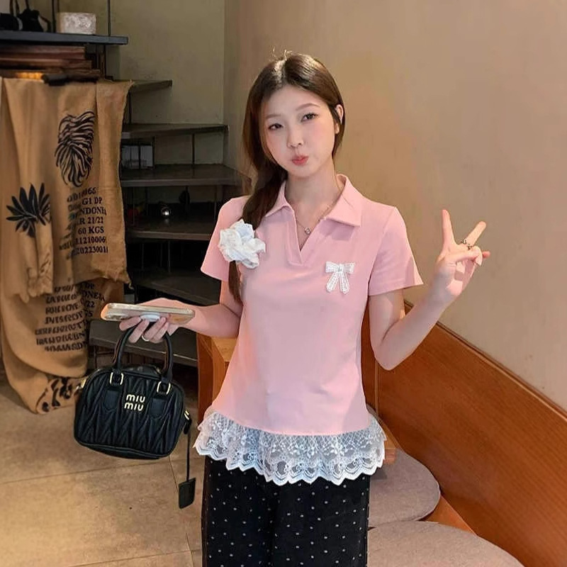 大码女夏装polo领短袖t恤女蕾丝拼接甜辣小衫胖mm显瘦休闲上衣女