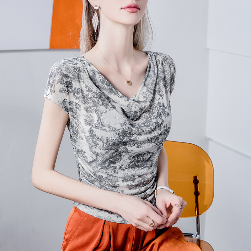 V领网纱T恤女短袖印花褶皱显瘦夏季新款洋气女装半袖上衣小衫