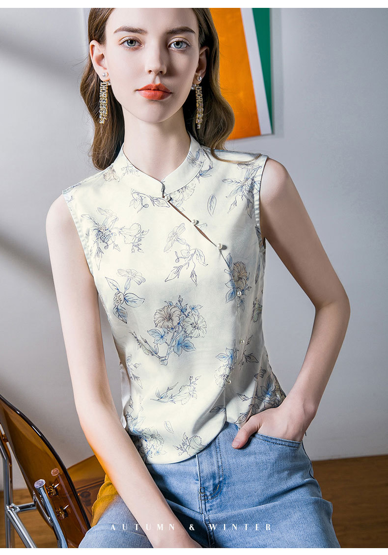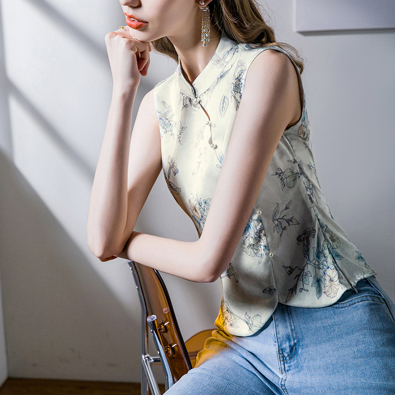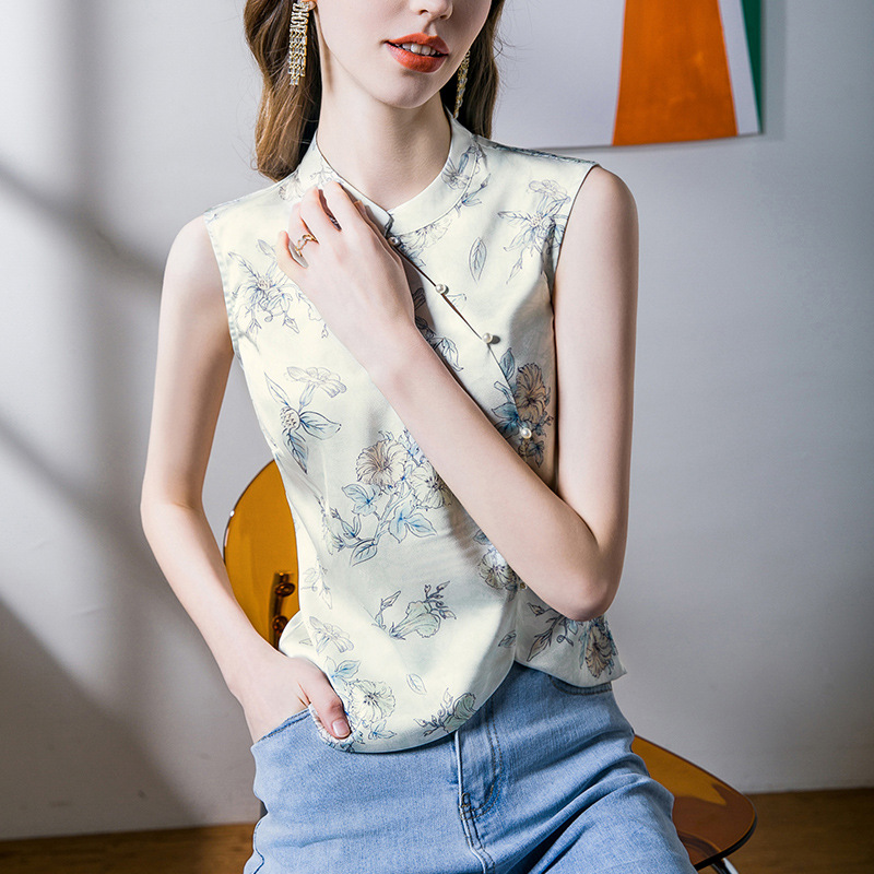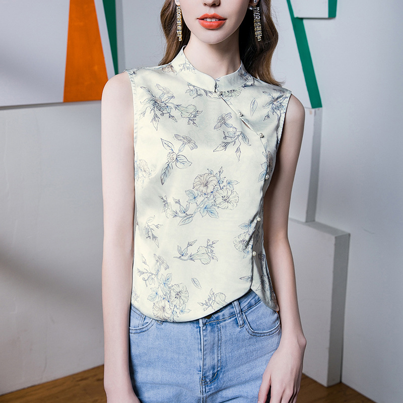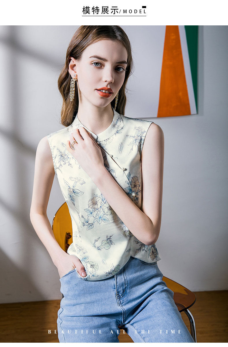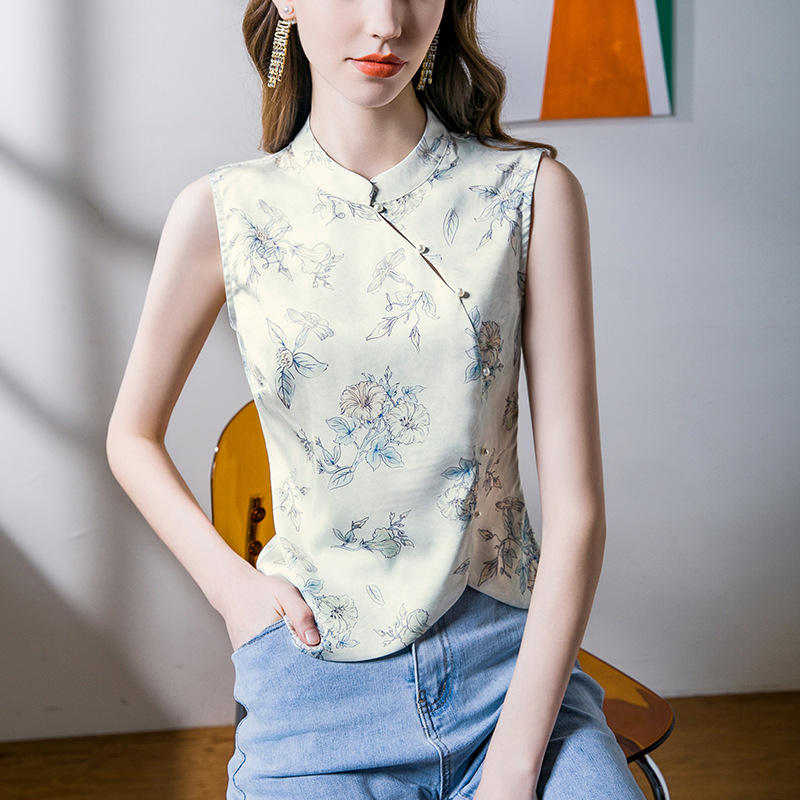 新中式旗袍领印花无袖上衣女修身不规则春季珍珠纽扣拉链背心