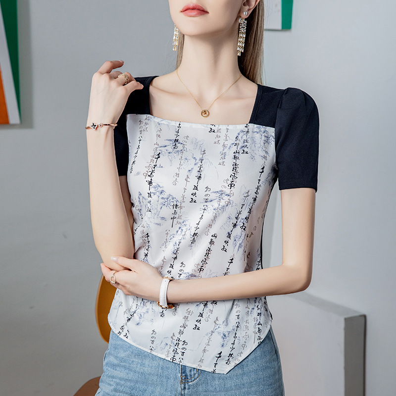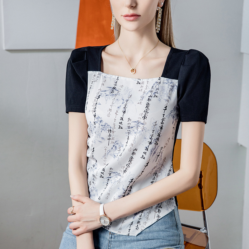 方领国风印花T恤女短袖夏季新款雪纺拼接女装泡泡袖上衣小衫