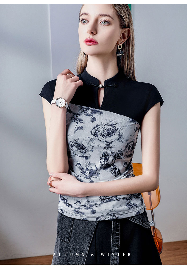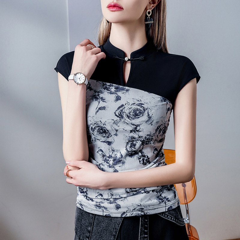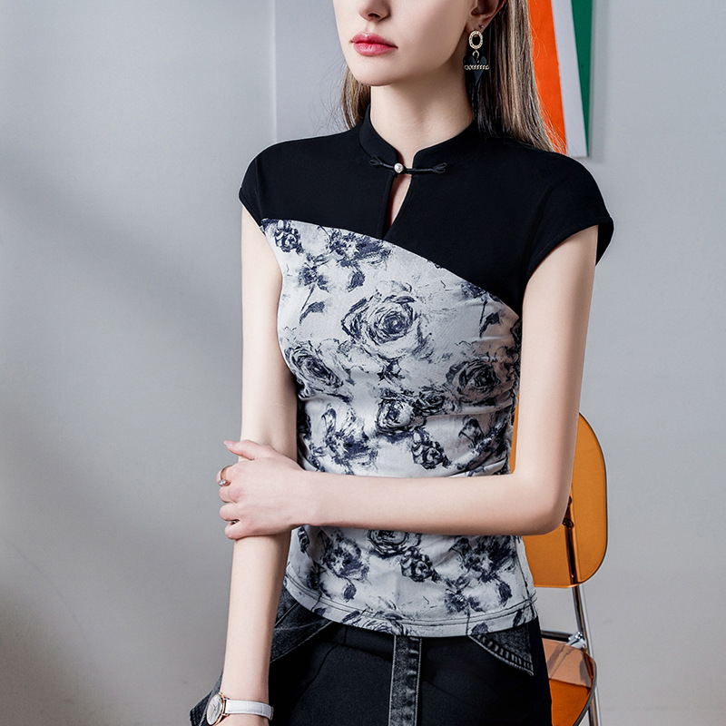 新中式立领盘扣印花拼接上衣女无袖春夏新款网纱包袖打底衫夏