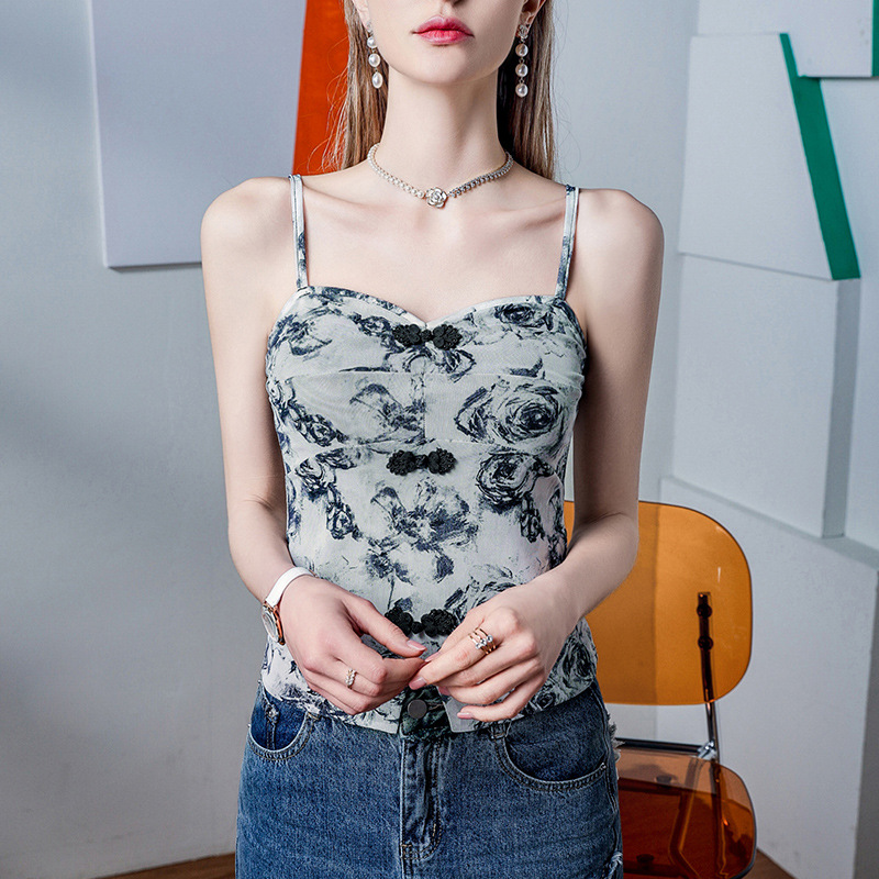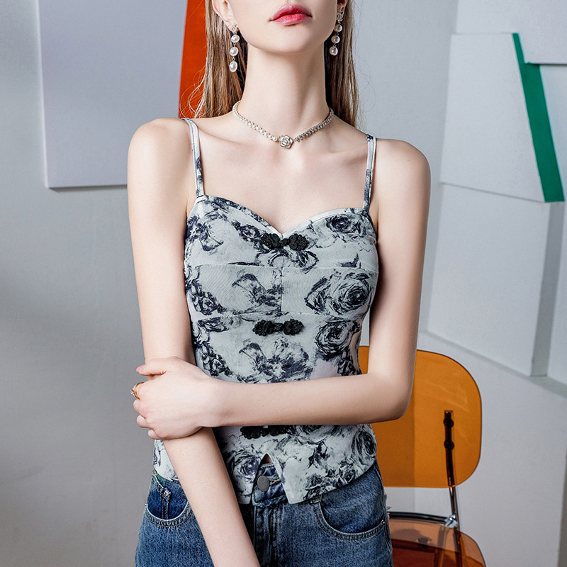 盘扣装饰复古印花吊带女修身短款美背春夏西装内搭新中式背心