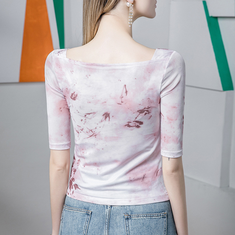 印花网纱一字领T恤女五分袖夏季新款女装中袖褶皱显瘦上衣