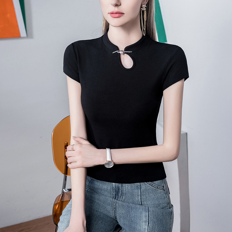 新中式盘扣立领白色T恤女短袖夏季新款镂空基础百搭女装小衫