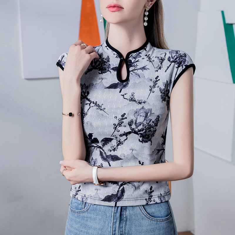 旗袍领印花网纱T恤女短袖修身夏季新款国风镂空洋气女装上衣