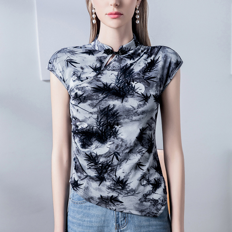 国风旗袍领网纱T恤女短袖夏季新款盘扣新中式女装包袖上衣