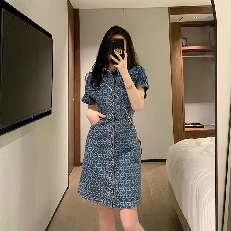 新款夏季法式茶歇重工提花小个子收腰显瘦小香风牛仔连衣裙子