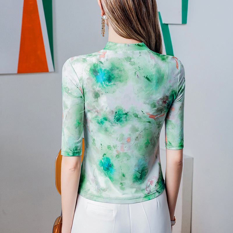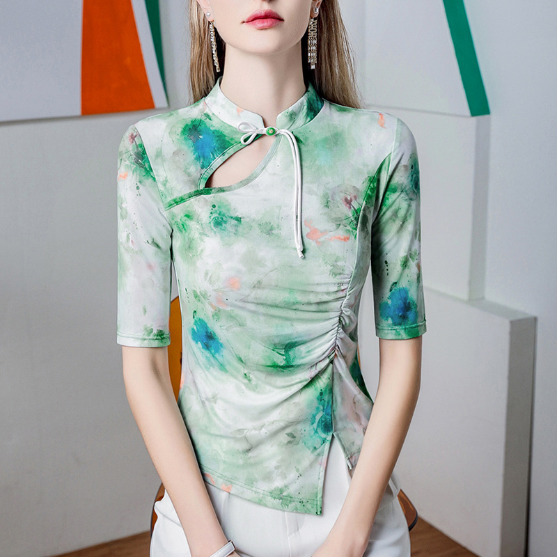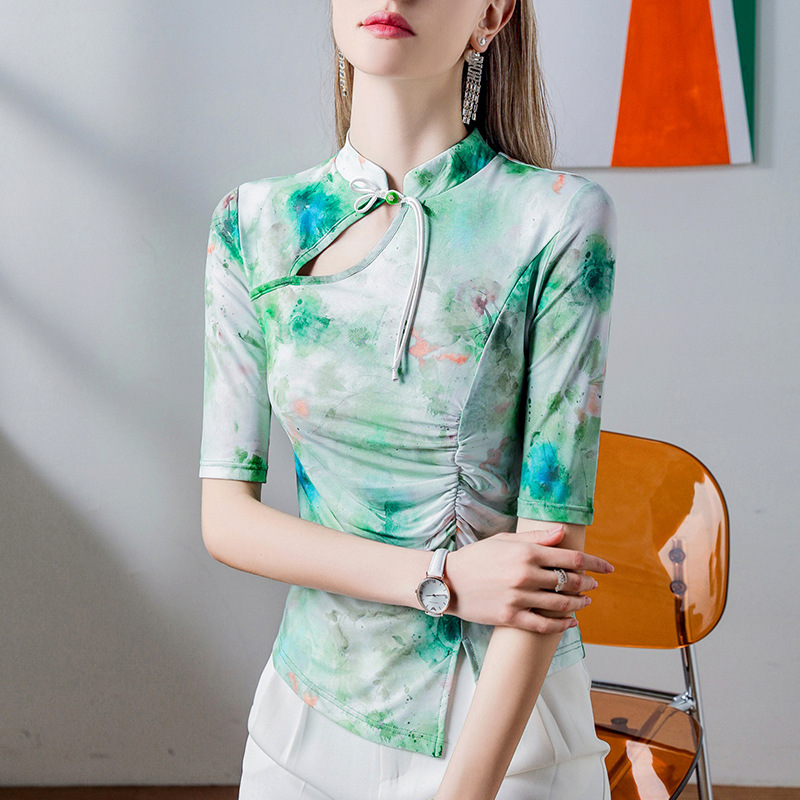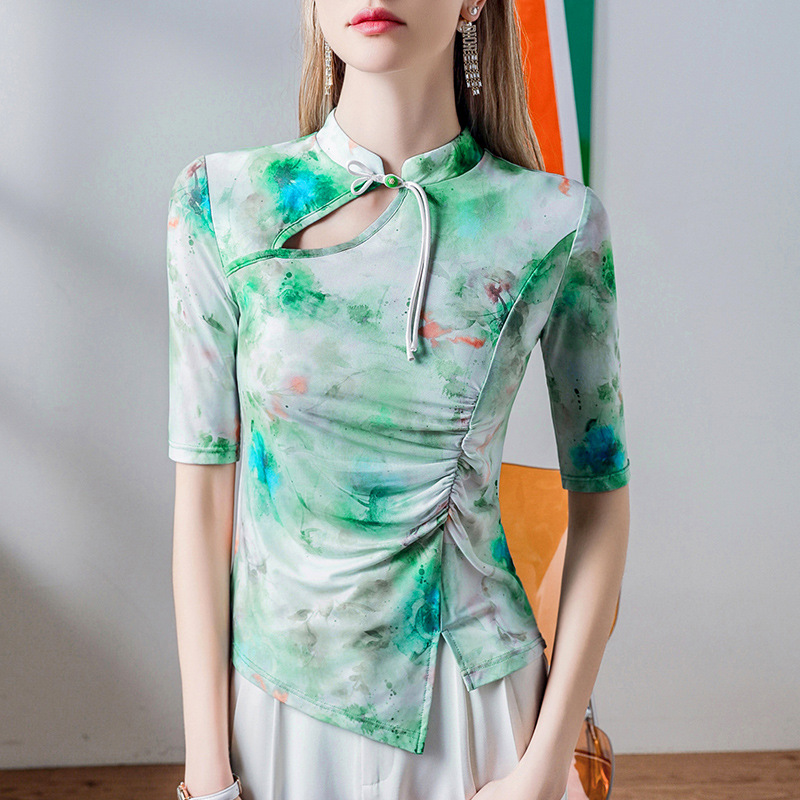新中式盘扣立领扎染印花上衣女五分袖夏季旗袍领中袖网纱T恤