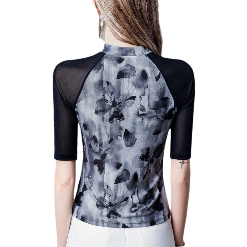 新中式盘扣旗袍立领网纱印花上衣女五分袖修身褶皱显瘦中袖T恤