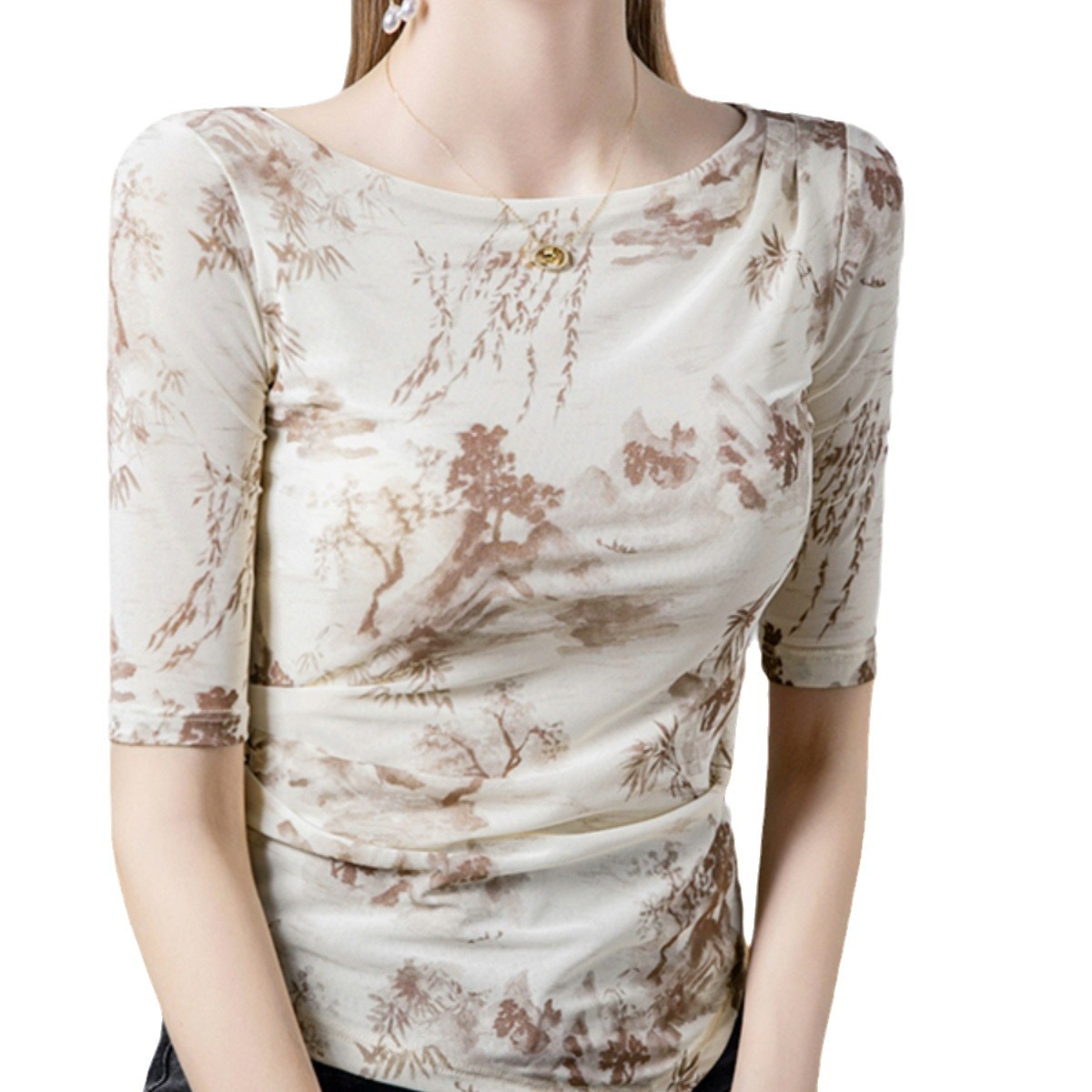 水墨印花一字领网纱T恤女五分袖夏季新款女装褶皱中袖上衣