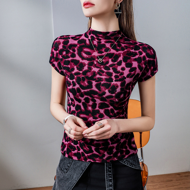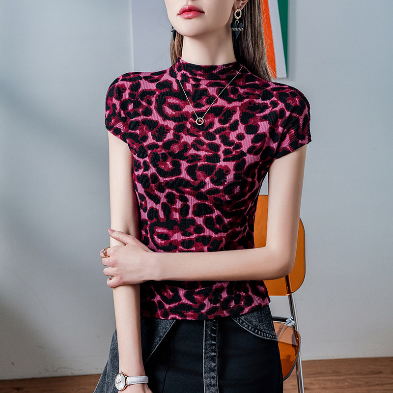 豹纹印花小立领T恤女短袖夏季新款女人味包袖时髦蕾丝打底衫