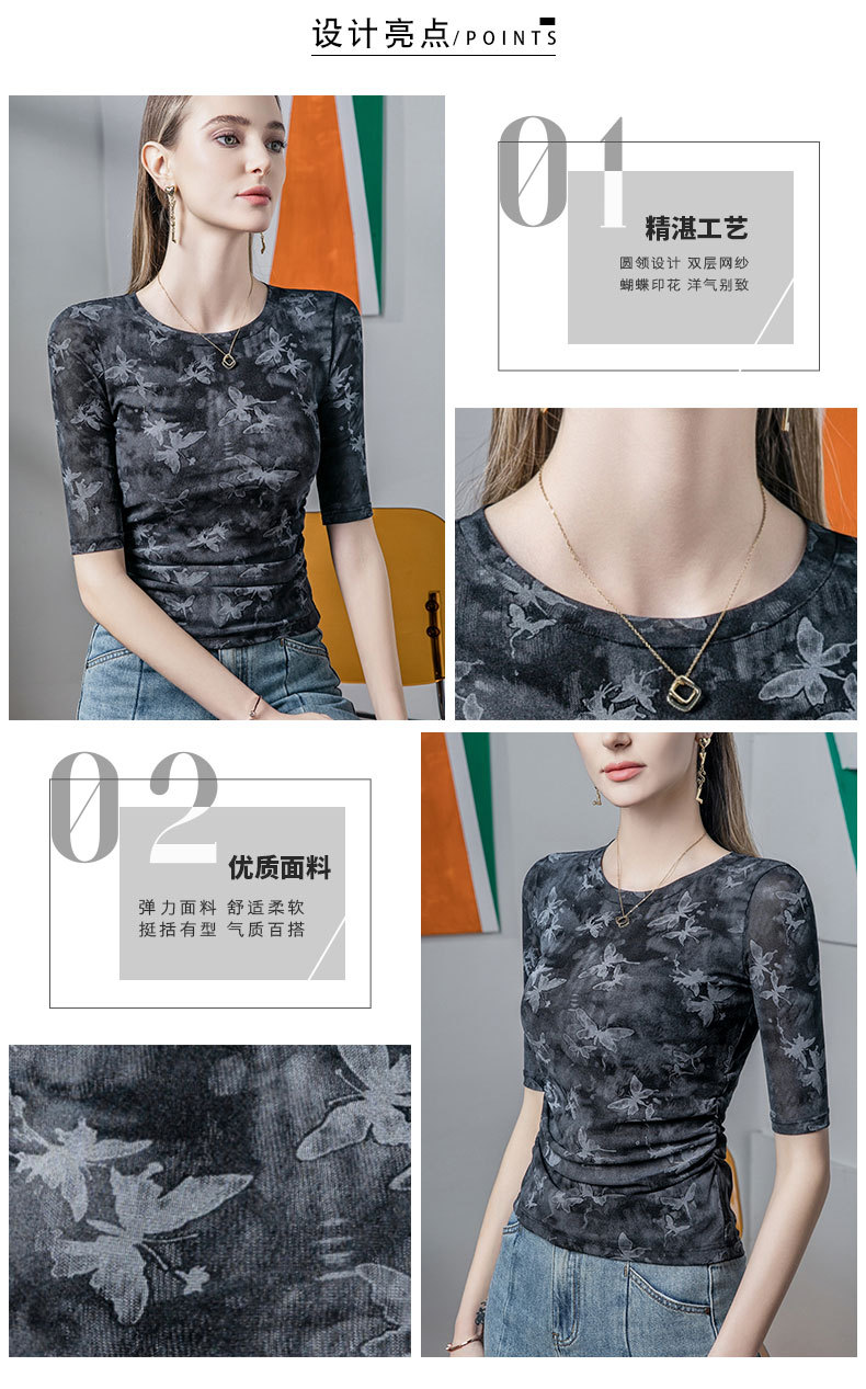 蝴蝶印花网纱圆领T恤女五分袖夏季新款女装半袖上衣中袖小衫