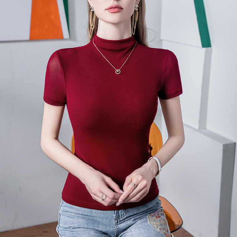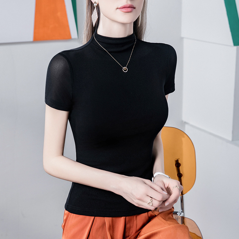 半高领双层网纱T恤女短袖修身夏季新款纯色百搭女装立领小衫