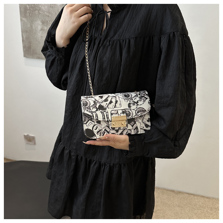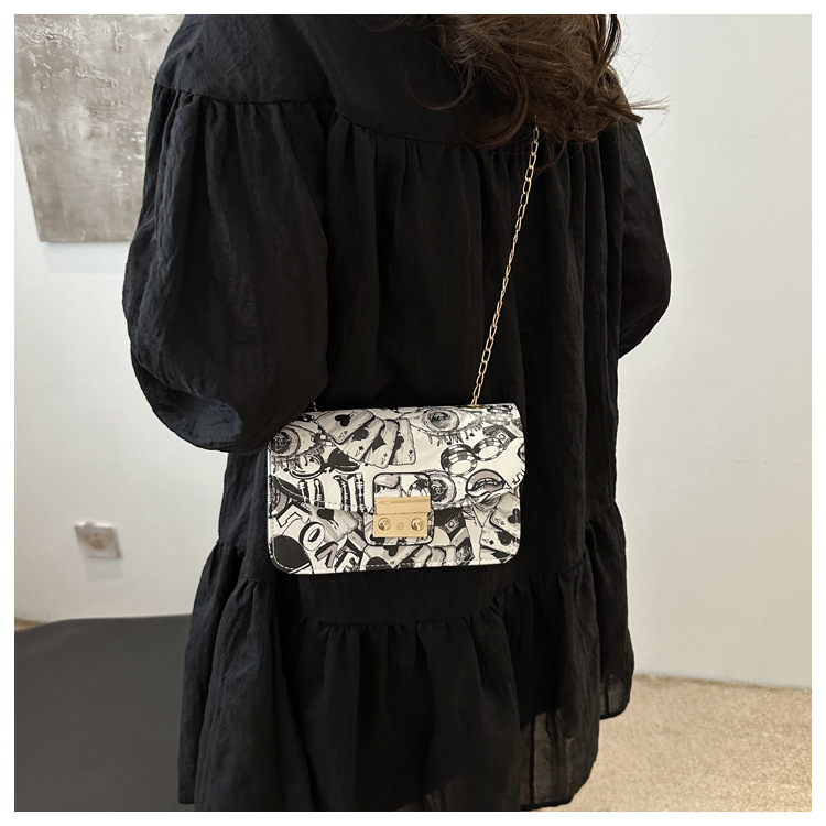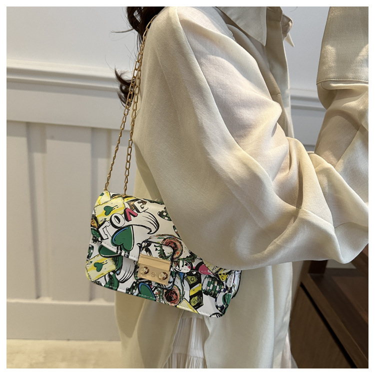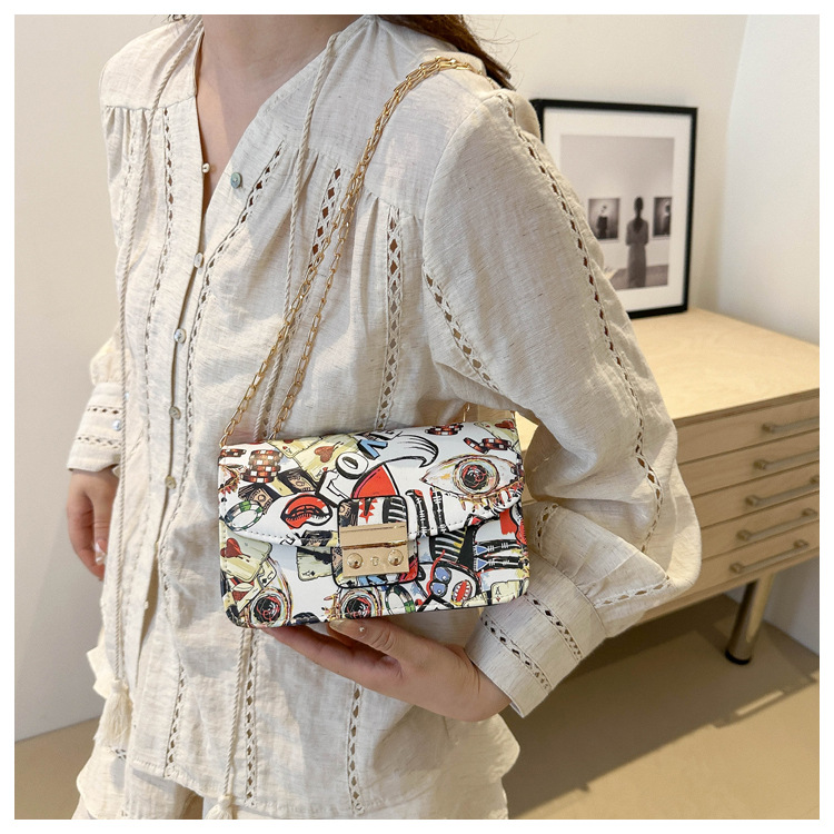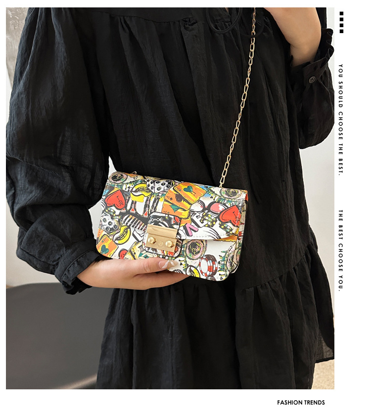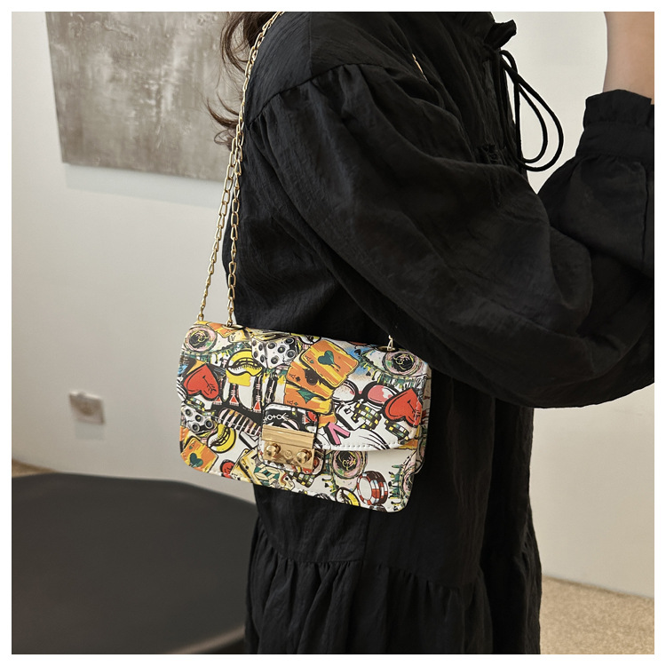 潮流韩版风范链条锁扣斜跨单肩新款时尚印花涂鸦个性小方包包