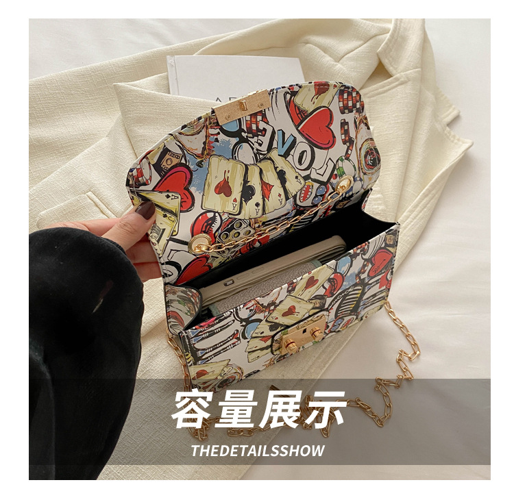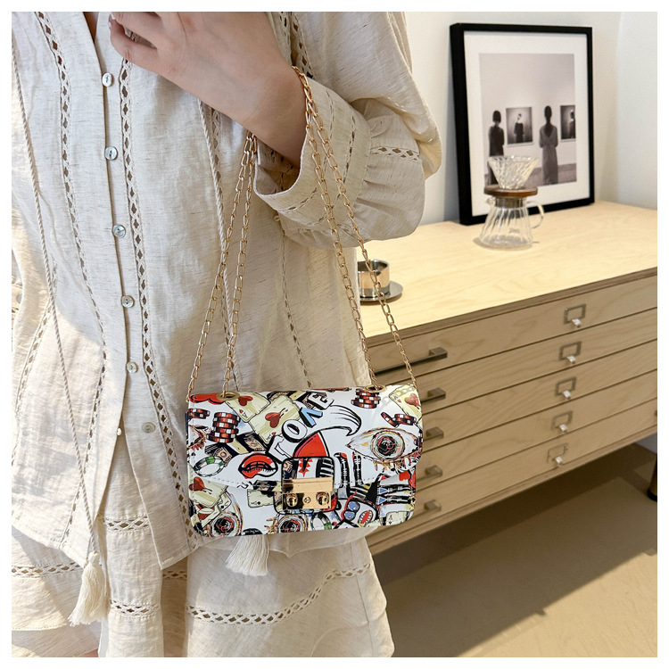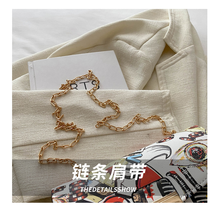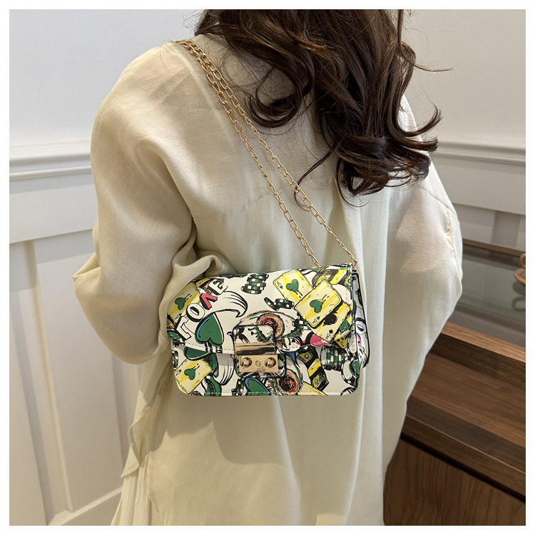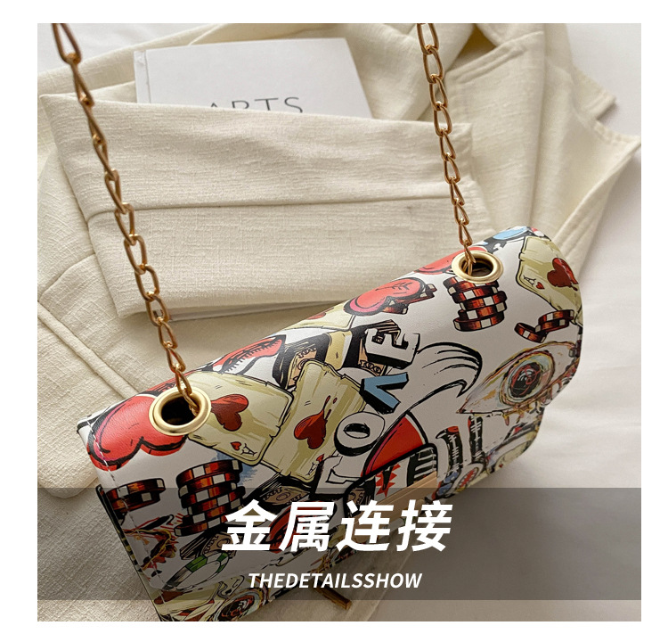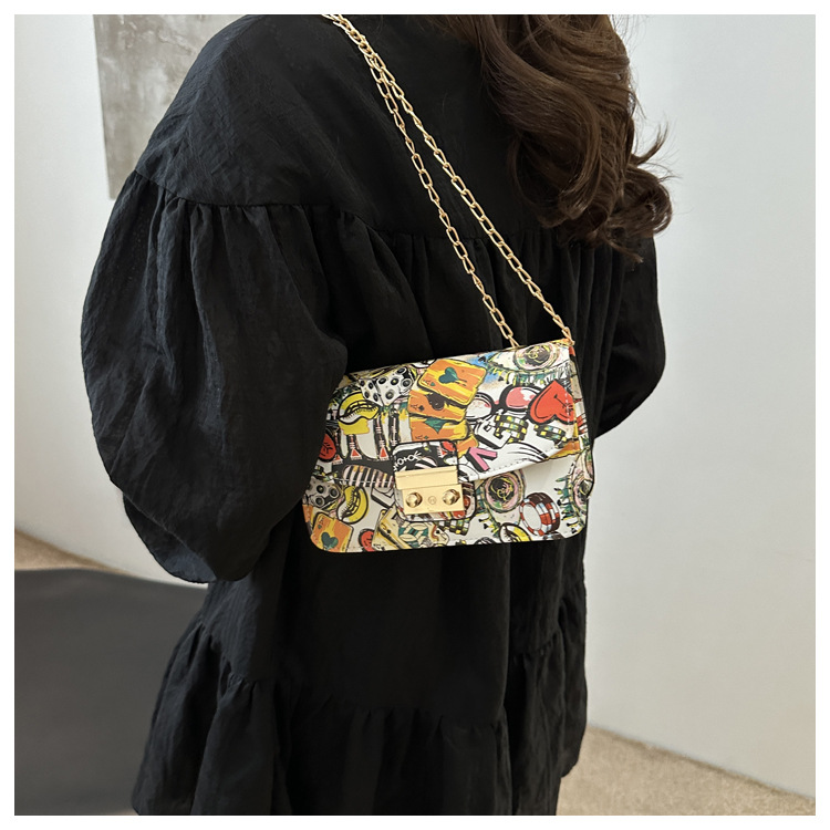 潮流韩版风范链条锁扣斜跨单肩新款时尚印花涂鸦个性小方包包