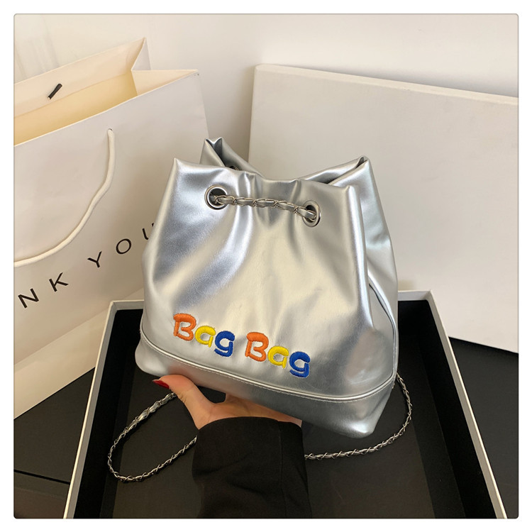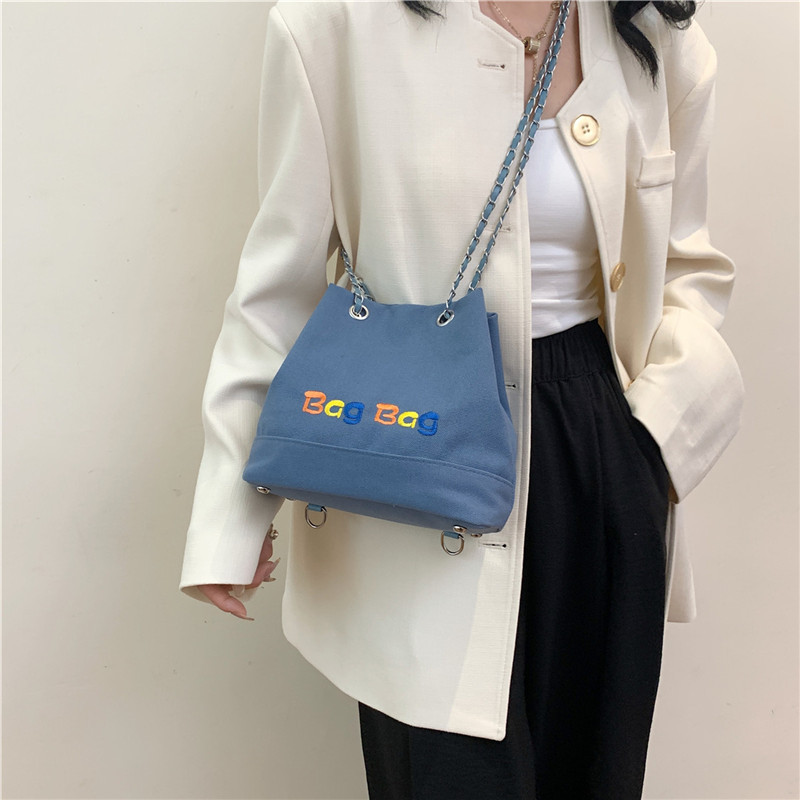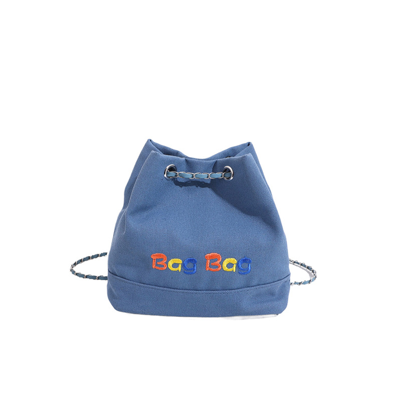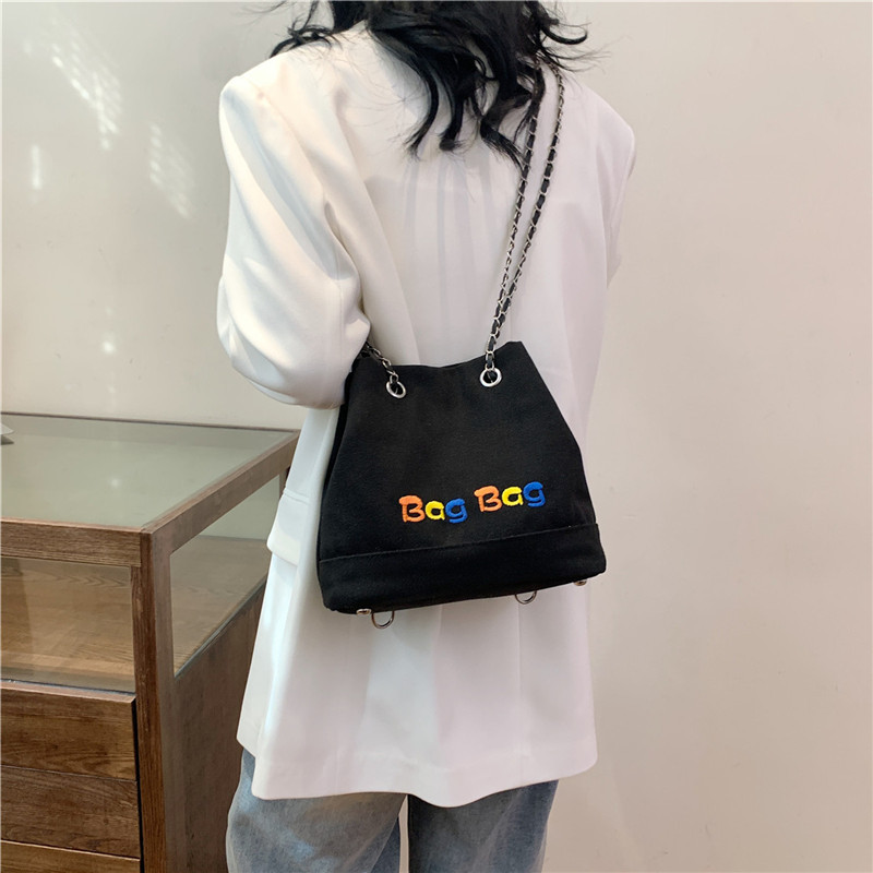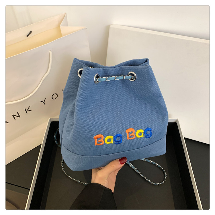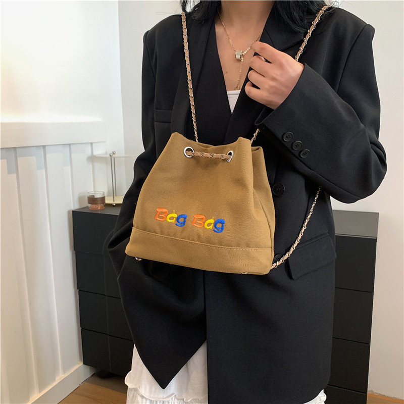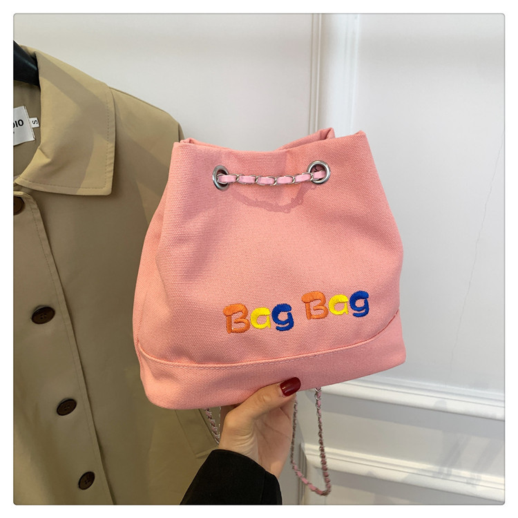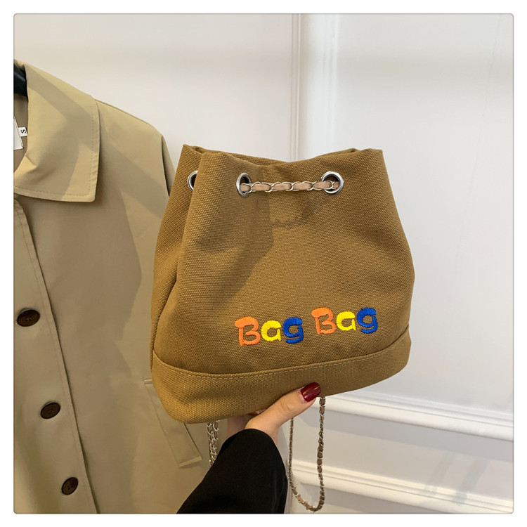 帆布小包包女新款时尚洋气链条字母抽带水桶包学生少女斜挎包