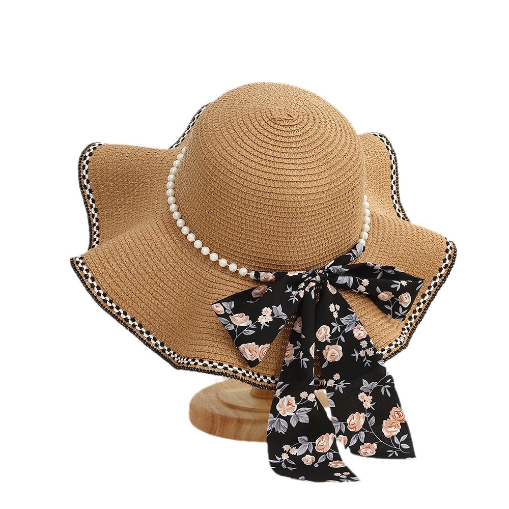 小清新甜美创意珍珠飘带遮阳帽夏季薄款气质波浪编织女士草帽