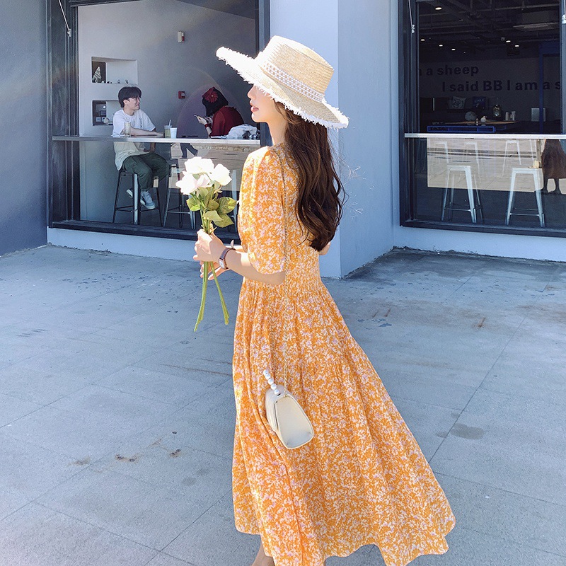 甜美泡泡袖橘色裙子女夏季新款法式中长款v领碎花雪纺连衣裙
