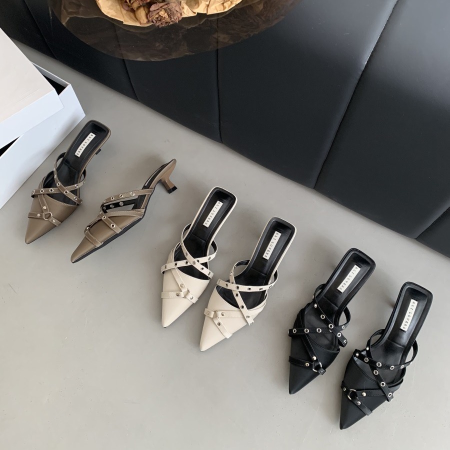 尖头一字带凉鞋女外穿新款时尚铆钉包头一脚蹬粗跟半拖鞋