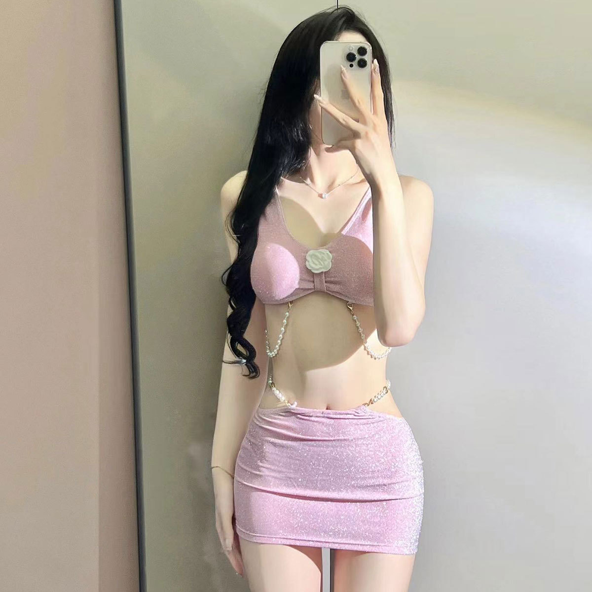 泳衣女性感比基尼三件套分体粉色辣妹网红风度假沙滩珍珠花朵链条