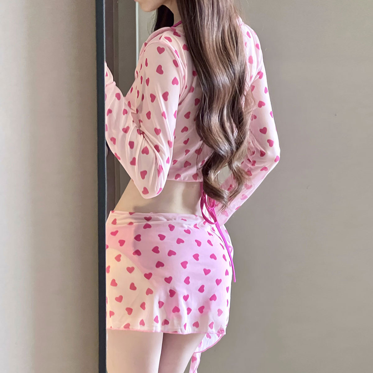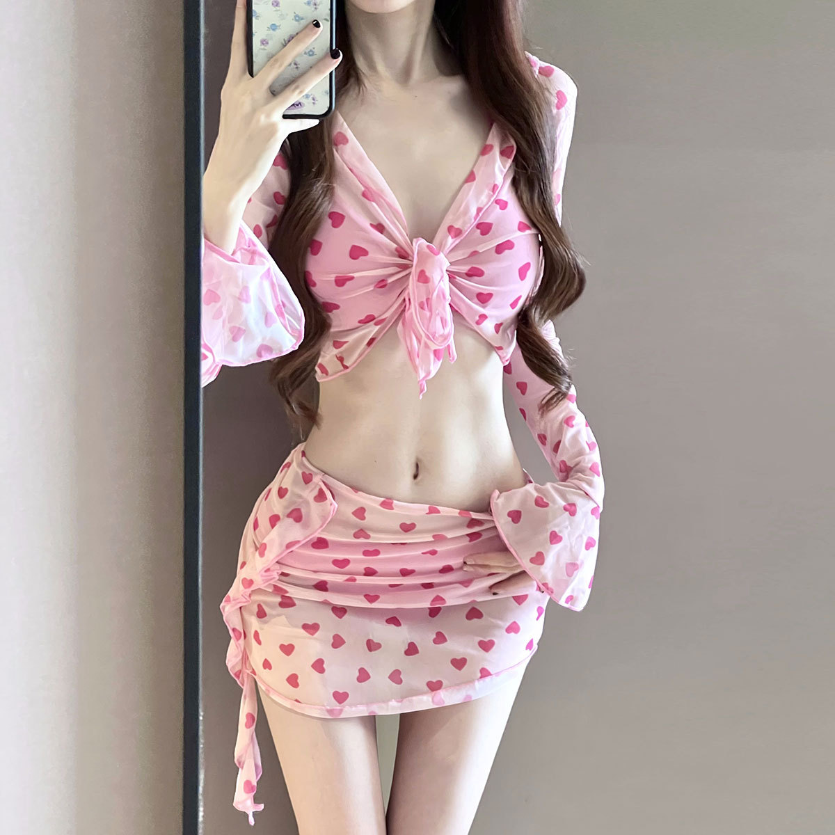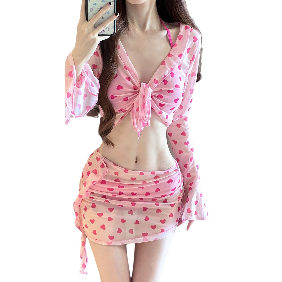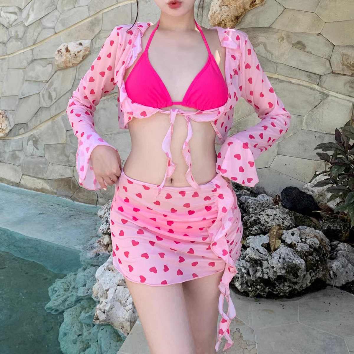 新款夏粉红少女四件套泳衣女分体绑带裙式温泉度假比基尼纯欲