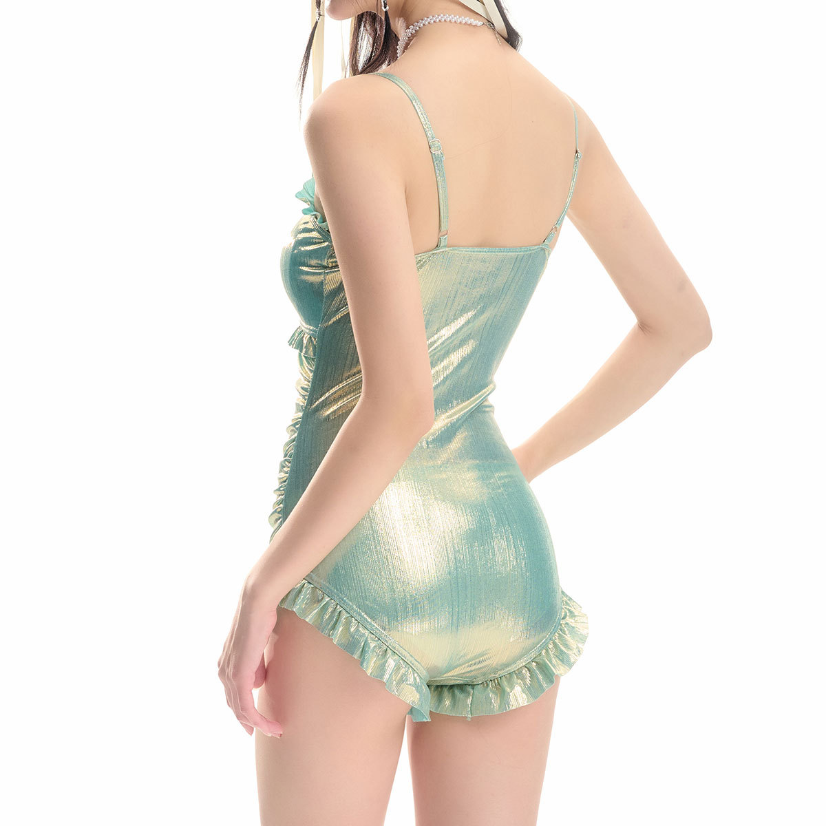 泳衣女小胸吊带性感流光连体高腰遮肉显瘦罩衫两件套泳装粉