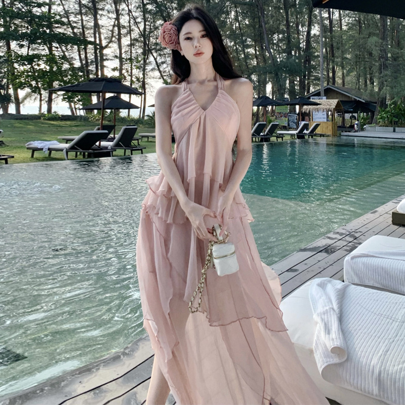 实拍樱花雨氛围感仙气不规则飘逸海边度假套装裙两件套旅游海岛裙