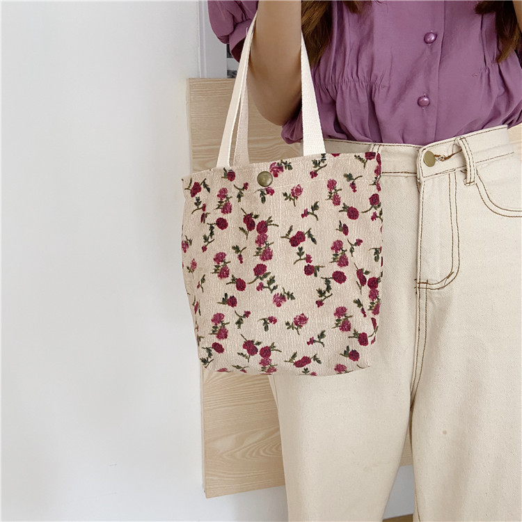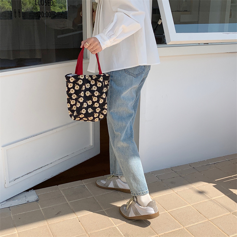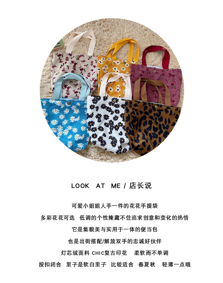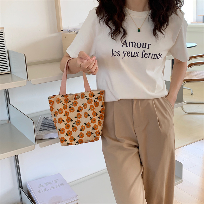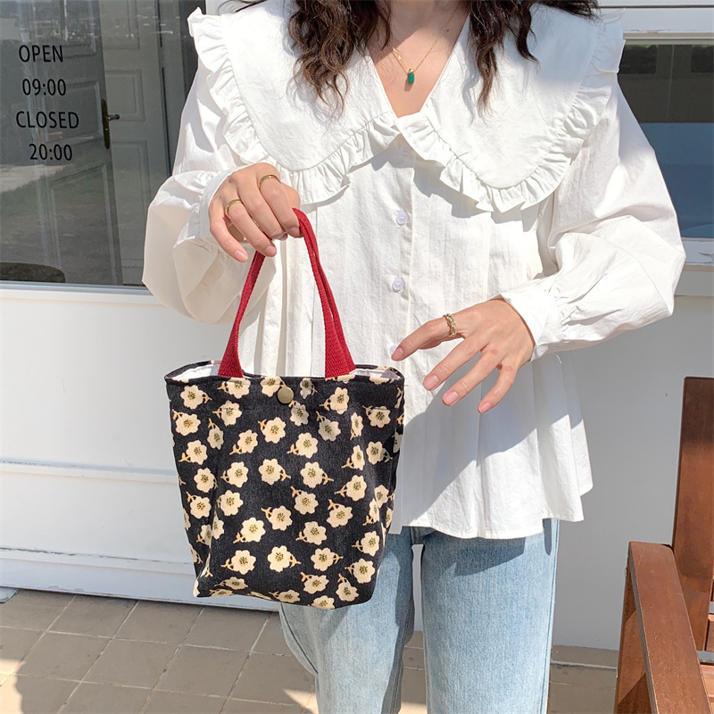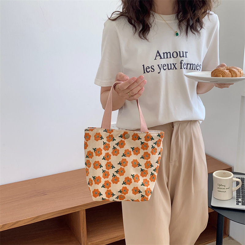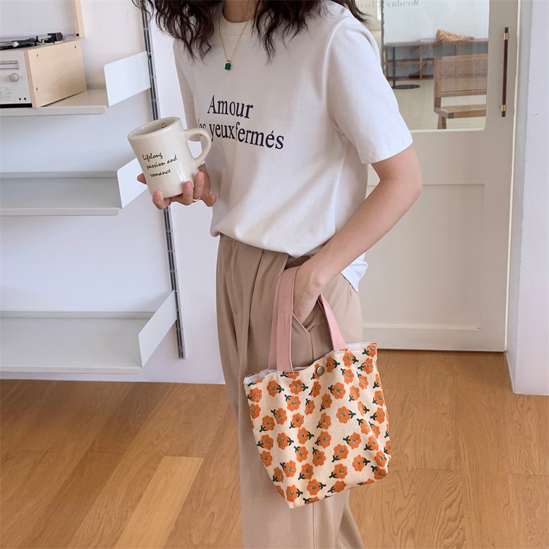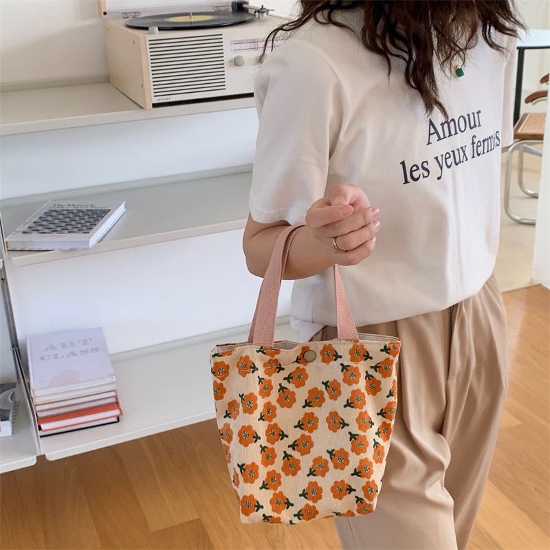 文艺灯芯绒午餐饭盒便当包可爱雏菊印花手拎手提收纳袋手拿
