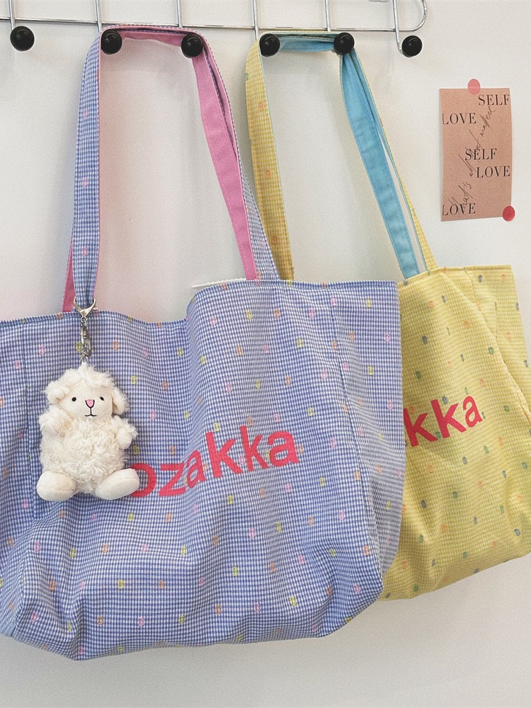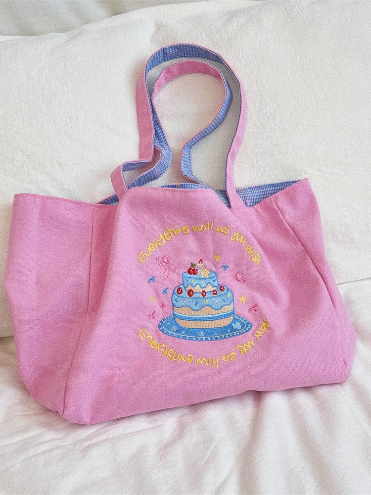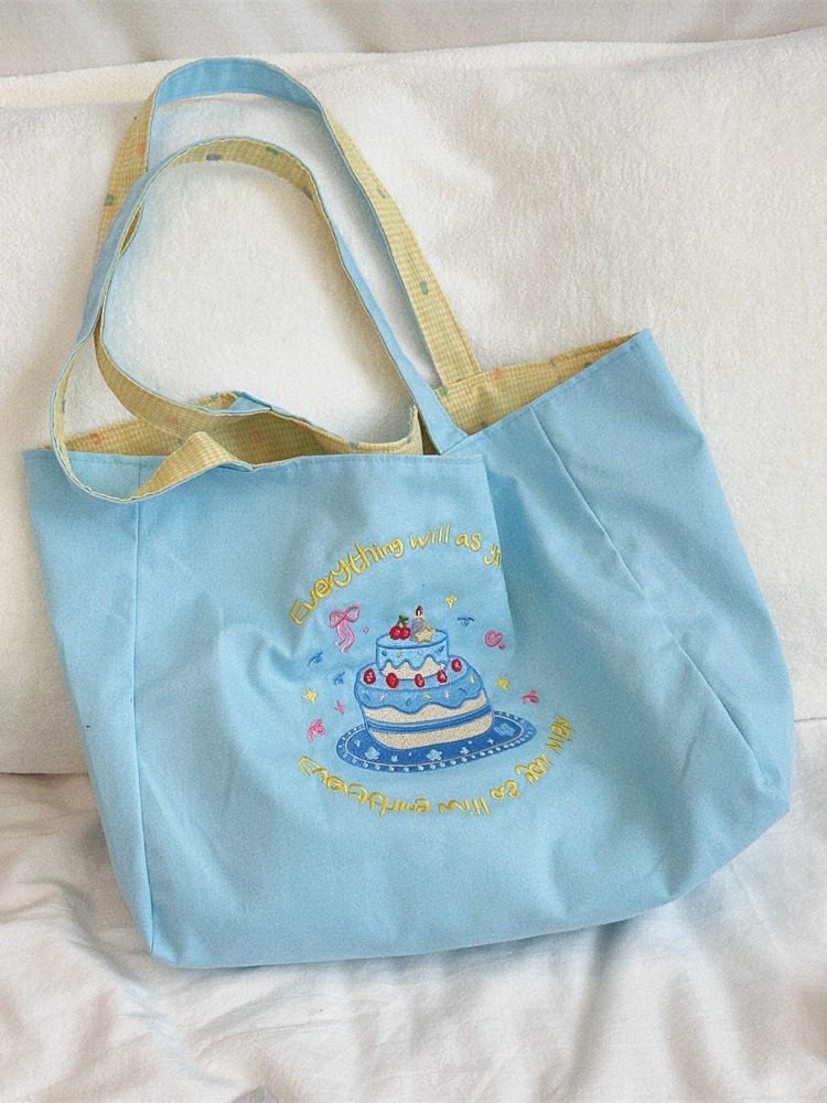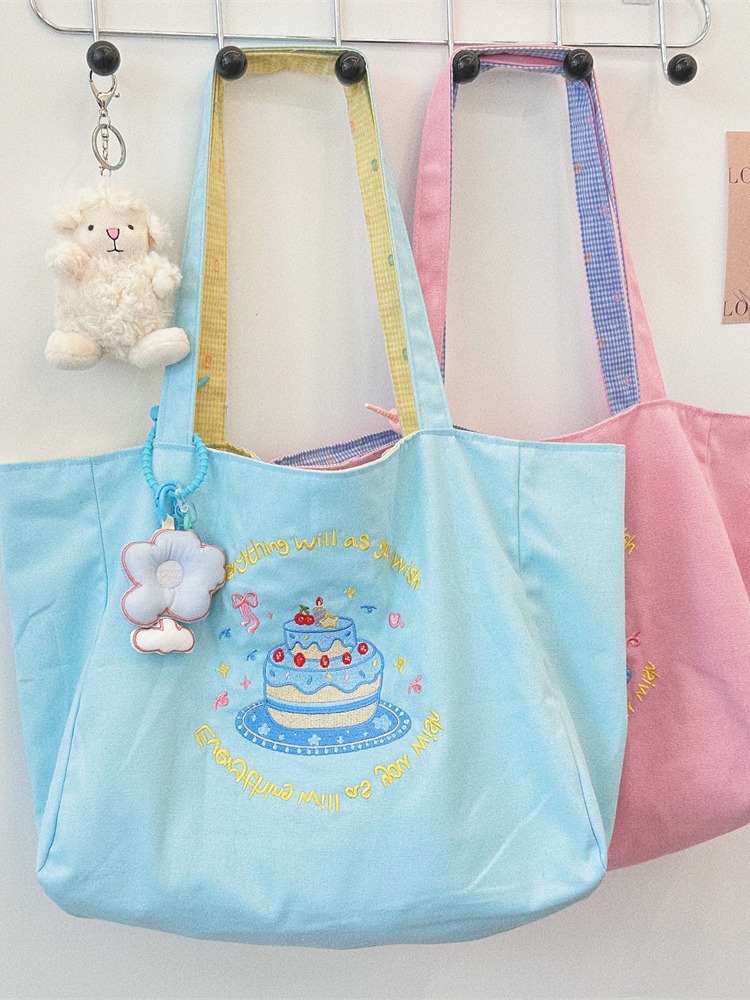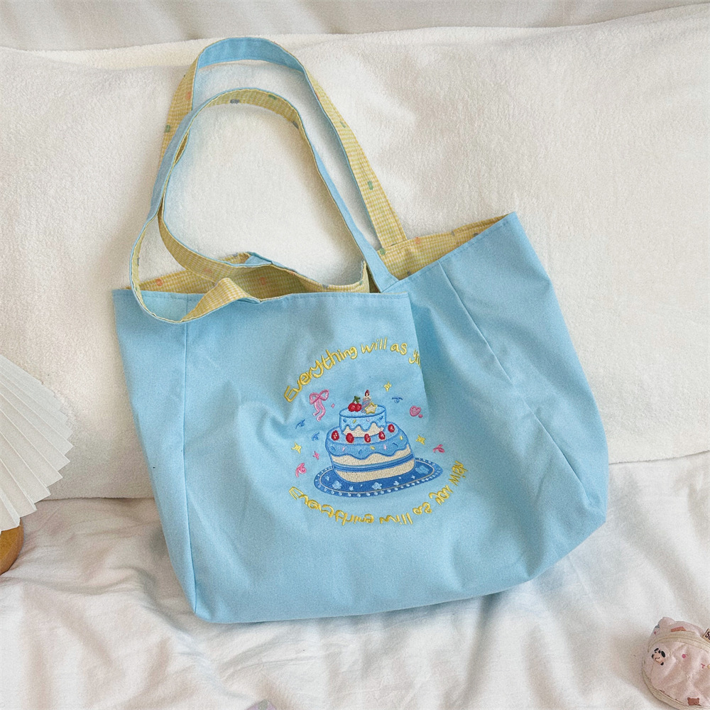 清新撞色两用单肩大容量托特包慵懒风刺绣帆布袋大学生背包