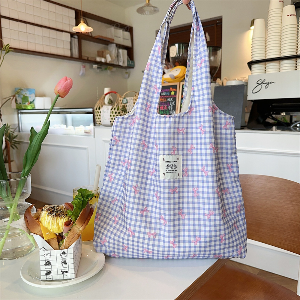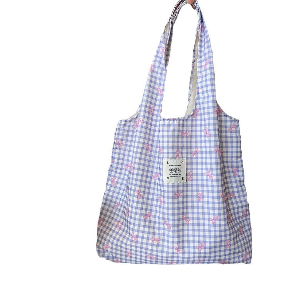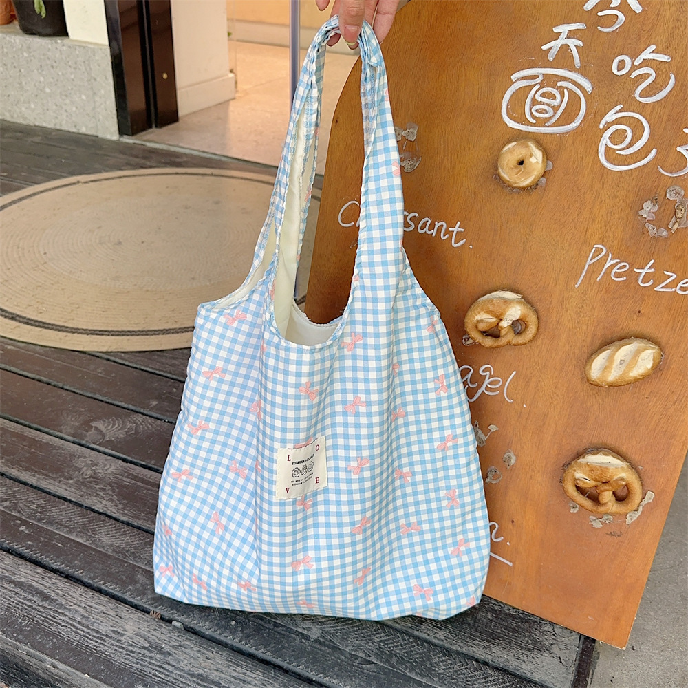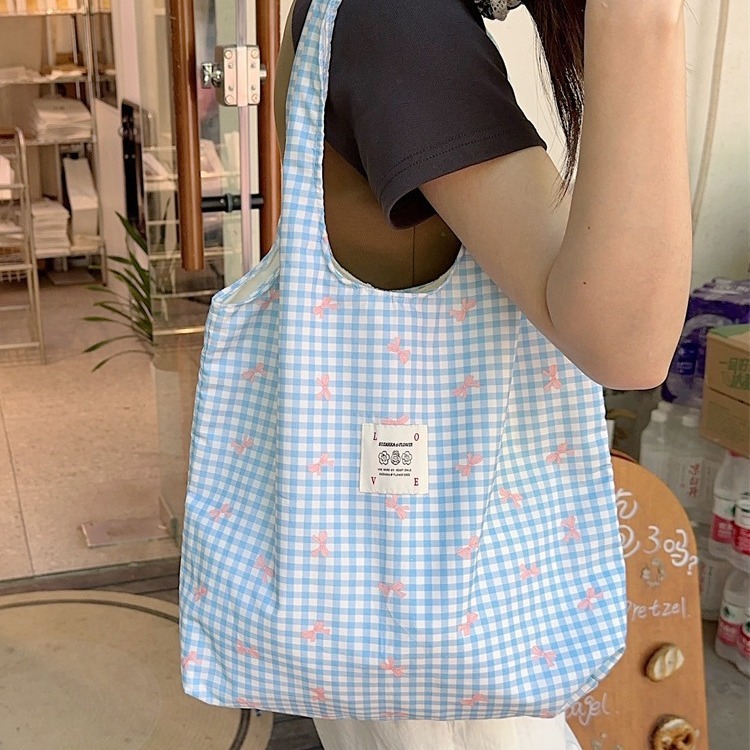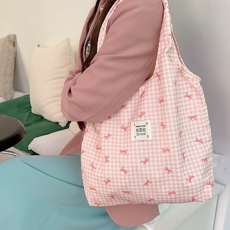 大容量简约印花蝴蝶结帆布包单肩包敞口女逛街购物袋背心包
